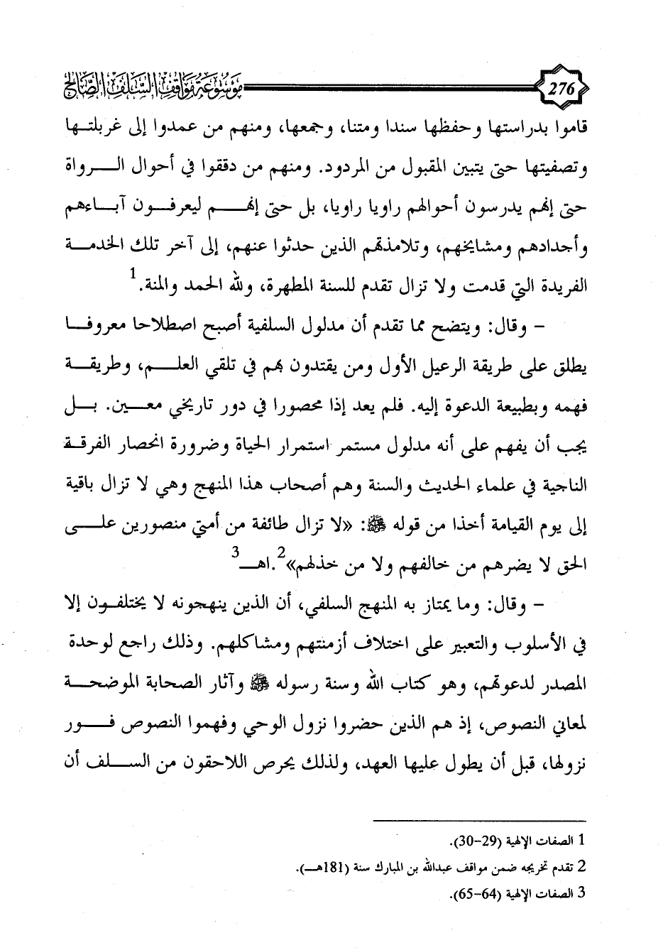 - وقال: ويتضح مما تقدم أن مدلول السلفية أصبح اصطلاحا معروفا يطلق على طريقة الرعيل الأول ومن يقتدون بهم في تلقي العلم، وطريقة فهمه وبطبيعة الدعوة إليه. فلم يعد إذا محصورا في دور تاريخي معين. بل يجب أن يفهم على أنه مدلول مستمر استمرار الحياة وضرورة انحصار الفرقة الناجية في علماء الحديث والسنة وهم أصحاب هذا المنهج وهي لا تزال باقية إلى يوم القيامة أخذا من قوله - صلى الله عليه وسلم -: «لا تزال طائفة من أمتي منصورين على الحق لا يضرهم من خالفهم ولا من خذلهم» (¬2).اهـ (¬3)
