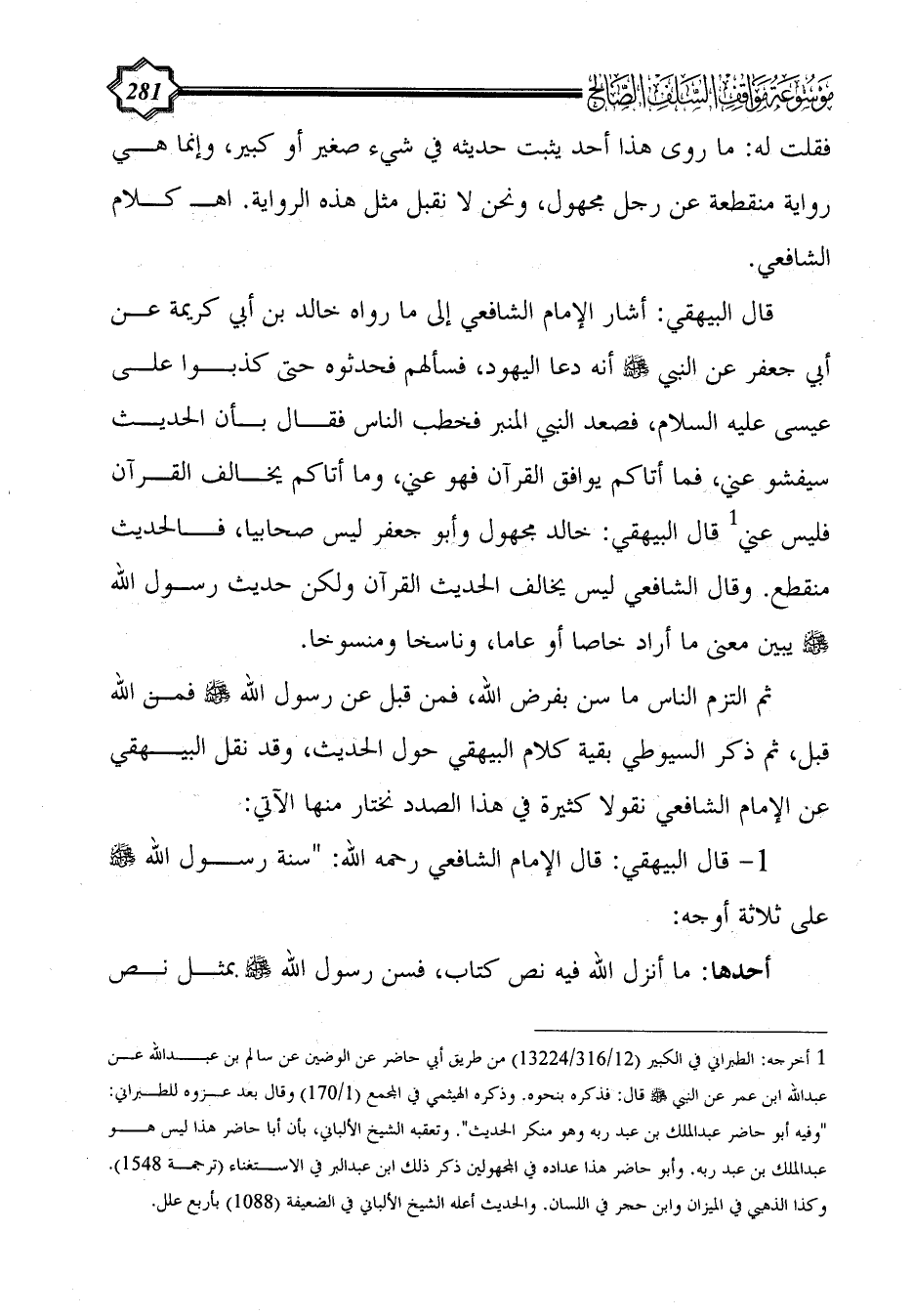 قال البيهقي: أشار الإمام الشافعي إلى ما رواه خالد بن أبي كريمة عن أبي جعفر عن النبي - صلى الله عليه وسلم - أنه دعا اليهود، فسألهم فحدثوه حتى كذبوا على عيسى عليه السلام، فصعد النبي المنبر فخطب الناس فقال بأن الحديث سيفشو عني، فما أتاكم يوافق القرآن فهو عني، وما أتاكم يخالف القرآن فليس عني (¬1) قال البيهقي: خالد مجهول وأبو جعفر ليس صحابيا، فالحديث منقطع. وقال الشافعي ليس يخالف الحديث القرآن ولكن حديث رسول الله - صلى الله عليه وسلم - يبين معنى ما أراد خاصا أو عاما، وناسخا ومنسوخا.