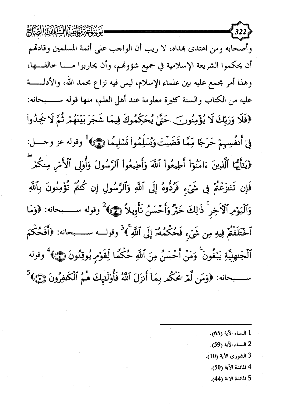 وأصحابه ومن اهتدى بهداه، لا ريب أن الواجب على أئمة المسلمين وقادتهم أن يحكموا الشريعة الإسلامية في جميع شؤونهم، وأن يحاربوا ما خالفها، وهذا أمر مجمع عليه بين علماء الإسلام، ليس فيه نزاع بحمد الله، والأدلة عليه من الكتاب والسنة كثيرة معلومة عند أهل العلم، منها قوله سبحانه: {فَلَا وَرَبِّكَ لَا يُؤْمِنُونَ حَتَّى يُحَكِّمُوكَ فِيمَا شَجَرَ بَيْنَهُمْ ثُمَّ لَا يَجِدُوا فِي أَنْفُسِهِمْ حَرَجًا مِمَّا قَضَيْتَ وَيُسَلِّمُوا تَسْلِيمًا (65)} (¬1) وقوله عز وجل: {يَا أَيُّهَا الَّذِينَ آَمَنُوا أَطِيعُوا اللَّهَ وَأَطِيعُوا الرَّسُولَ وَأُولِي الْأَمْرِ مِنْكُمْ فَإِنْ تَنَازَعْتُمْ فِي شَيْءٍ فَرُدُّوهُ إِلَى اللَّهِ وَالرَّسُولِ إِنْ كُنْتُمْ تُؤْمِنُونَ بِاللَّهِ وَالْيَوْمِ الْآَخِرِ ذَلِكَ خَيْرٌ وَأَحْسَنُ تَأْوِيلًا (59)} (¬2) وقوله سبحانه: {وَمَا اخْتَلَفْتُمْ فِيهِ مِنْ شَيْءٍ فَحُكْمُهُ إِلَى اللَّهِ} (¬3) وقوله سبحانه: {أَفَحُكْمَ الْجَاهِلِيَّةِ يَبْغُونَ وَمَنْ أَحْسَنُ مِنَ اللَّهِ حُكْمًا لِقَوْمٍ يُوقِنُونَ (50)} (¬4) وقوله سبحانه: {وَمَنْ لَمْ يَحْكُمْ بِمَا أَنْزَلَ اللَّهُ فَأُولَئِكَ هُمُ الْكَافِرُونَ (44)} (¬5)