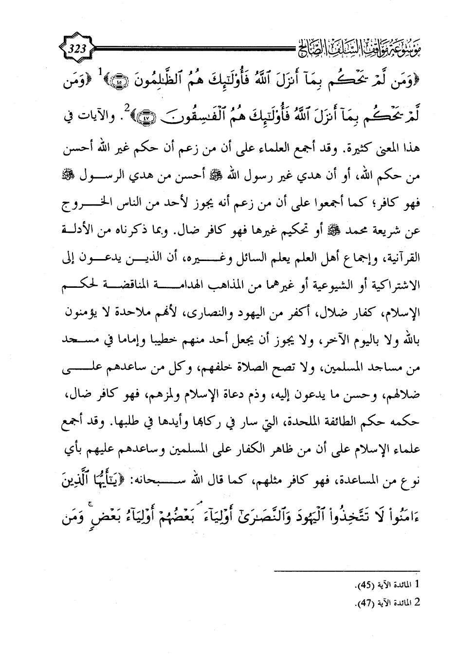 {وَمَنْ لَمْ يَحْكُمْ بِمَا أَنْزَلَ اللَّهُ فَأُولَئِكَ هُمُ الظَّالِمُونَ (45)} (¬1) {وَمَنْ لَمْ يَحْكُمْ بِمَا أَنْزَلَ اللَّهُ فَأُولَئِكَ هُمُ الْفَاسِقُونَ (47)} (¬2). والآيات في هذا المعنى كثيرة.
