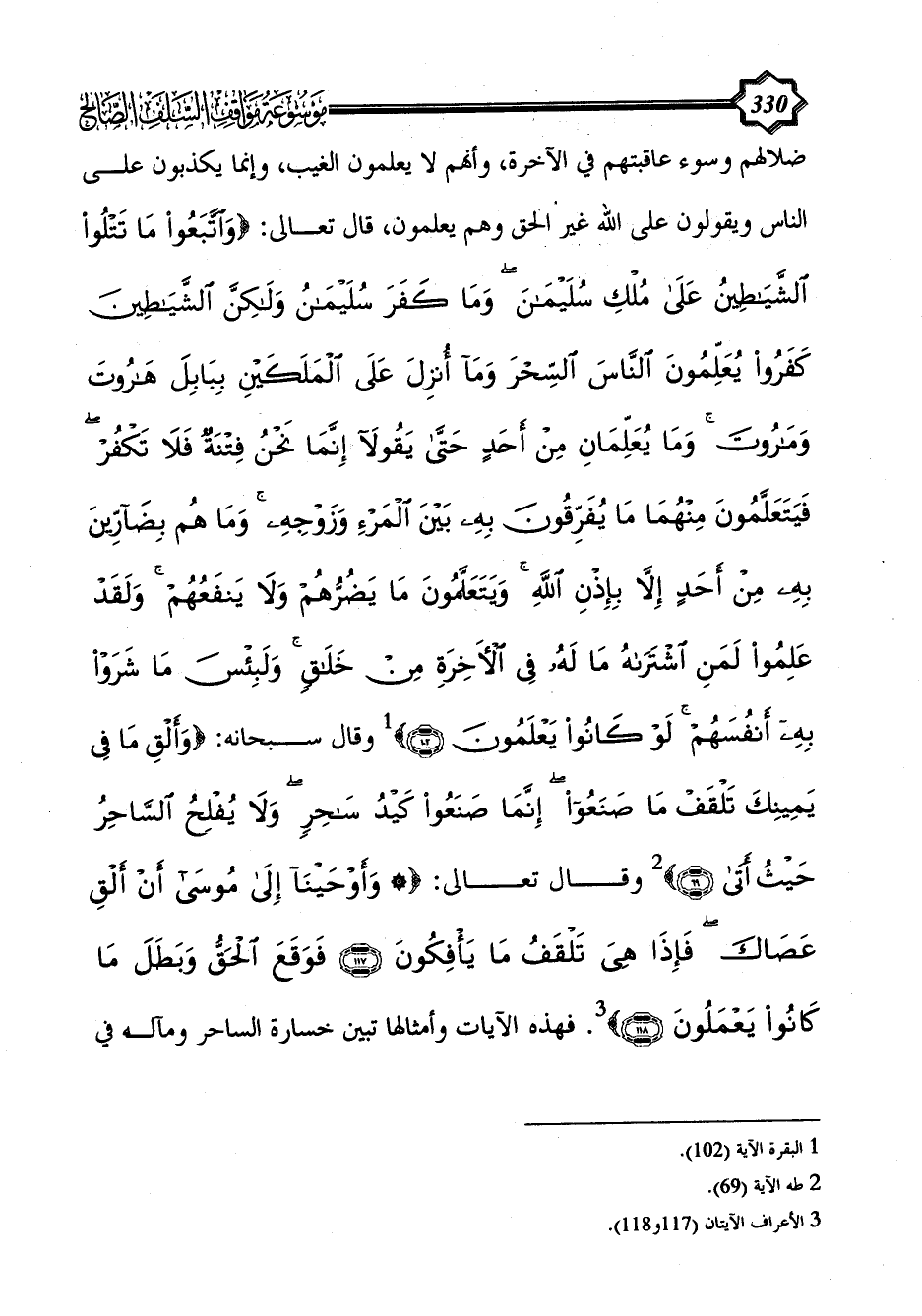وقال سبحانه: {وَأَلْقِ مَا فِي يَمِينِكَ تَلْقَفْ مَا صَنَعُوا إِنَّمَا صَنَعُوا كَيْدُ سَاحِرٍ وَلَا يُفْلِحُ السَّاحِرُ حَيْثُ أَتَى (69)} (¬2) وقال تعالى: {* وَأَوْحَيْنَا إِلَى مُوسَى أَنْ أَلْقِ عَصَاكَ فَإِذَا هِيَ تَلْقَفُ مَا يَأْفِكُونَ (117) فَوَقَعَ الْحَقُّ وَبَطَلَ مَا كَانُوا يَعْمَلُونَ (118)} (¬3). فهذه الآيات وأمثالها تبين خسارة الساحر ومآله في