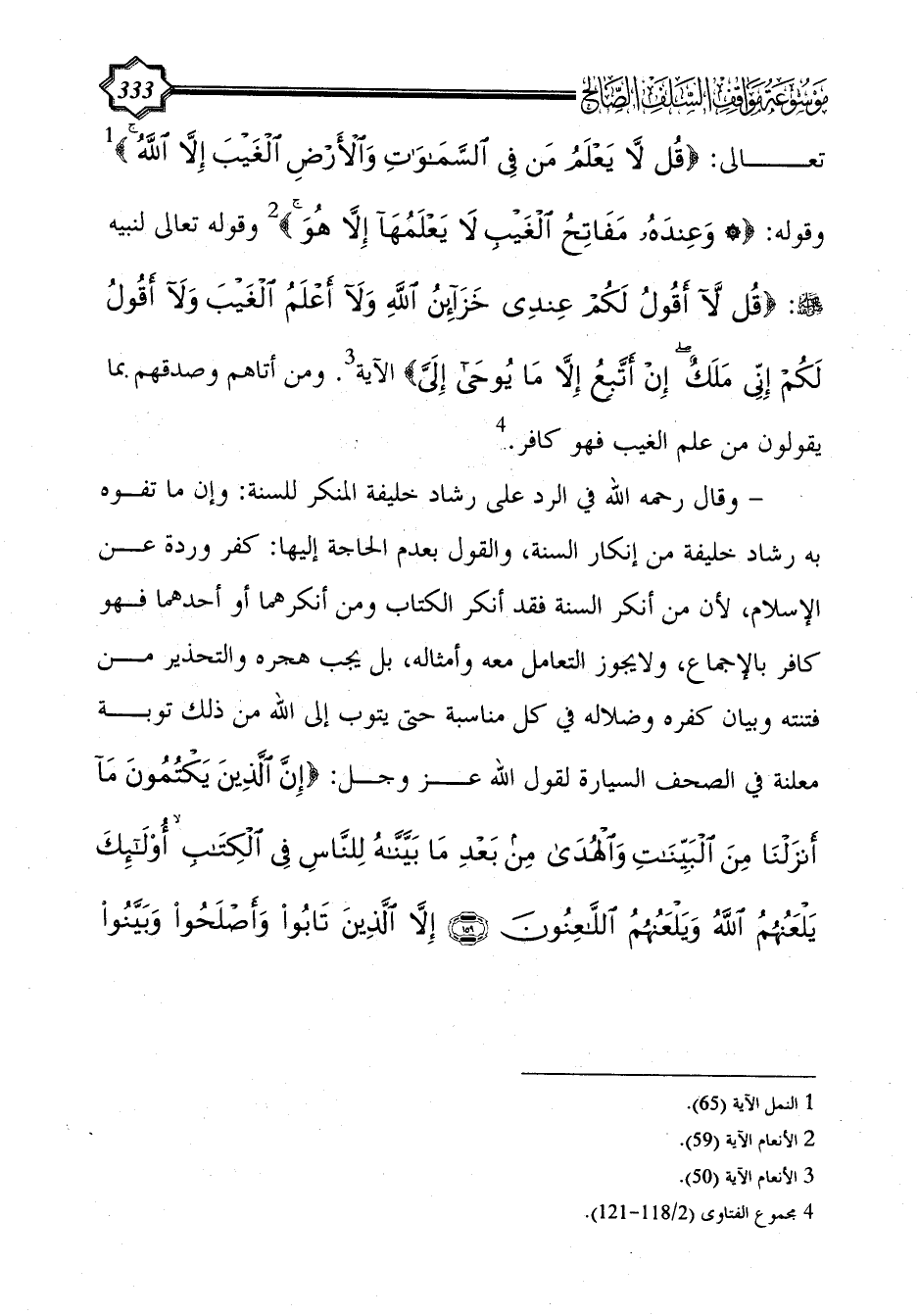 - وقال رحمه الله في الرد على رشاد خليفة المنكر للسنة: وإن ما تفوه به رشاد خليفة من إنكار السنة، والقول بعدم الحاجة إليها: كفر وردة عن الإسلام، لأن من أنكر السنة فقد أنكر الكتاب ومن أنكرهما أو أحدهما فهو كافر بالإجماع، ولايجوز التعامل معه وأمثاله، بل يجب هجره والتحذير من فتنته وبيان كفره وضلاله في كل مناسبة حتى يتوب إلى الله من ذلك توبة معلنة في الصحف السيارة لقول الله عز وجل: {إِنَّ الَّذِينَ يَكْتُمُونَ مَا أَنْزَلْنَا مِنَ الْبَيِّنَاتِ وَالْهُدَى مِنْ بَعْدِ مَا بَيَّنَّاهُ لِلنَّاسِ فِي الْكِتَابِ أُولَئِكَ يَلْعَنُهُمُ اللَّهُ وَيَلْعَنُهُمُ اللَّاعِنُونَ (159) إِلَّا الَّذِينَ تَابُوا وَأَصْلَحُوا وَبَيَّنُوا