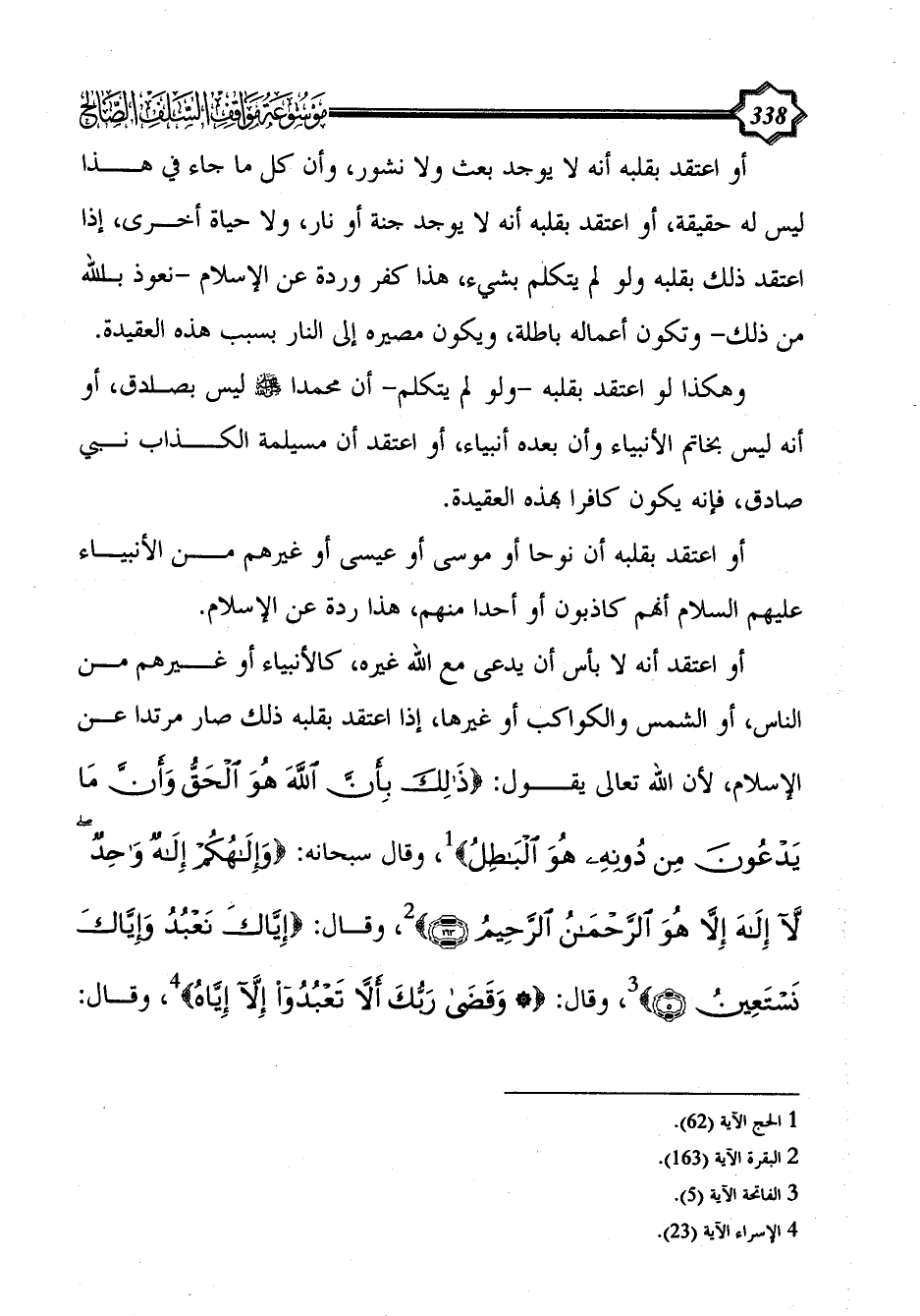 أو اعتقد أنه لا بأس أن يدعى مع الله غيره، كالأنبياء أو غيرهم من الناس، أو الشمس والكواكب أو غيرها، إذا اعتقد بقلبه ذلك صار مرتدا عن الإسلام، لأن الله تعالى يقول: {ذَلِكَ بِأَنَّ اللَّهَ هُوَ الْحَقُّ وَأَن مَا يَدْعُونَ مِنْ دُونِهِ هُوَ الْبَاطِلُ} (¬1)، وقال سبحانه: {وَإِلَهُكُمْ إِلَهٌ وَاحِدٌ لَا إِلَهَ إِلَّا هُوَ الرَّحْمَنُ الرَّحِيمُ (163)} (¬2)، وقال: {إِيَّاكَ نَعْبُدُ وَإِيَّاكَ نَسْتَعِينُ (5)} (¬3)، وقال: {* وَقَضَى رَبُّكَ أَلَّا تَعْبُدُوا إِلَّا إِيَّاهُ} (¬4)، وقال: