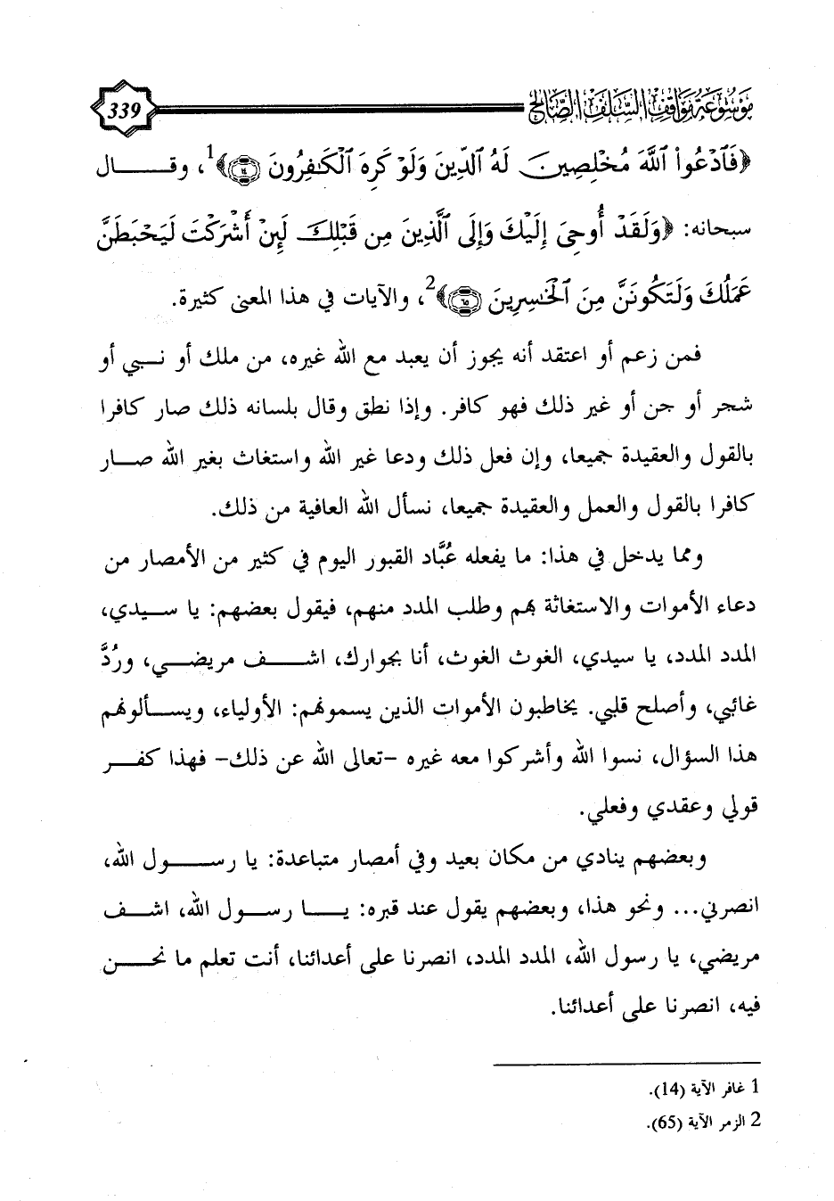 {فَادْعُوا اللَّهَ مُخْلِصِينَ لَهُ الدِّينَ وَلَوْ كَرِهَ الْكَافِرُونَ (14)} (¬1)، وقال سبحانه: {وَلَقَدْ أُوحِيَ إِلَيْكَ وَإِلَى الَّذِينَ مِنْ قَبْلِكَ لَئِنْ أَشْرَكْتَ لَيَحْبَطَنَّ عَمَلُكَ وَلَتَكُونَنَّ مِنَ الْخَاسِرِينَ (65)} (¬2)، والآيات في هذا المعنى كثيرة.