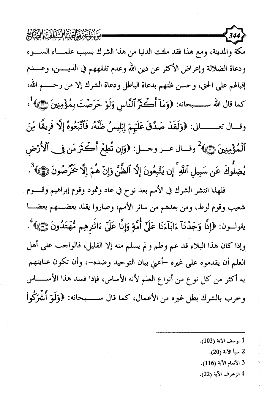 مكة والمدينة، ومع هذا فقد ملئت الدنيا من هذا الشرك بسبب علماء السوء ودعاة الضلالة وإعراض الأكثر عن دين الله وعدم تفقههم في الدين، وعدم إقبالهم على الحق، وحسن ظنهم بدعاة الباطل ودعاة الشرك إلا من رحم الله، كما قال الله سبحانه: {وَمَا أَكْثَرُ النَّاسِ وَلَوْ حَرَصْتَ بِمُؤْمِنِينَ (103)} (¬1)، وقال تعالى: {وَلَقَدْ صَدَّقَ عَلَيْهِمْ إِبْلِيسُ ظَنَّهُ فَاتَّبَعُوهُ إِلَّا فَرِيقًا مِنَ الْمُؤْمِنِينَ (20)} (¬2) وقال عز وجل: {وَإِنْ تُطِعْ أَكْثَرَ مَنْ فِي الْأَرْضِ يُضِلُّوكَ عَنْ سَبِيلِ اللَّهِ إِنْ يَتَّبِعُونَ إِلَّا الظَّنَّ وَإِنْ هُمْ إِلَّا يَخْرُصُونَ (116)} (¬3).