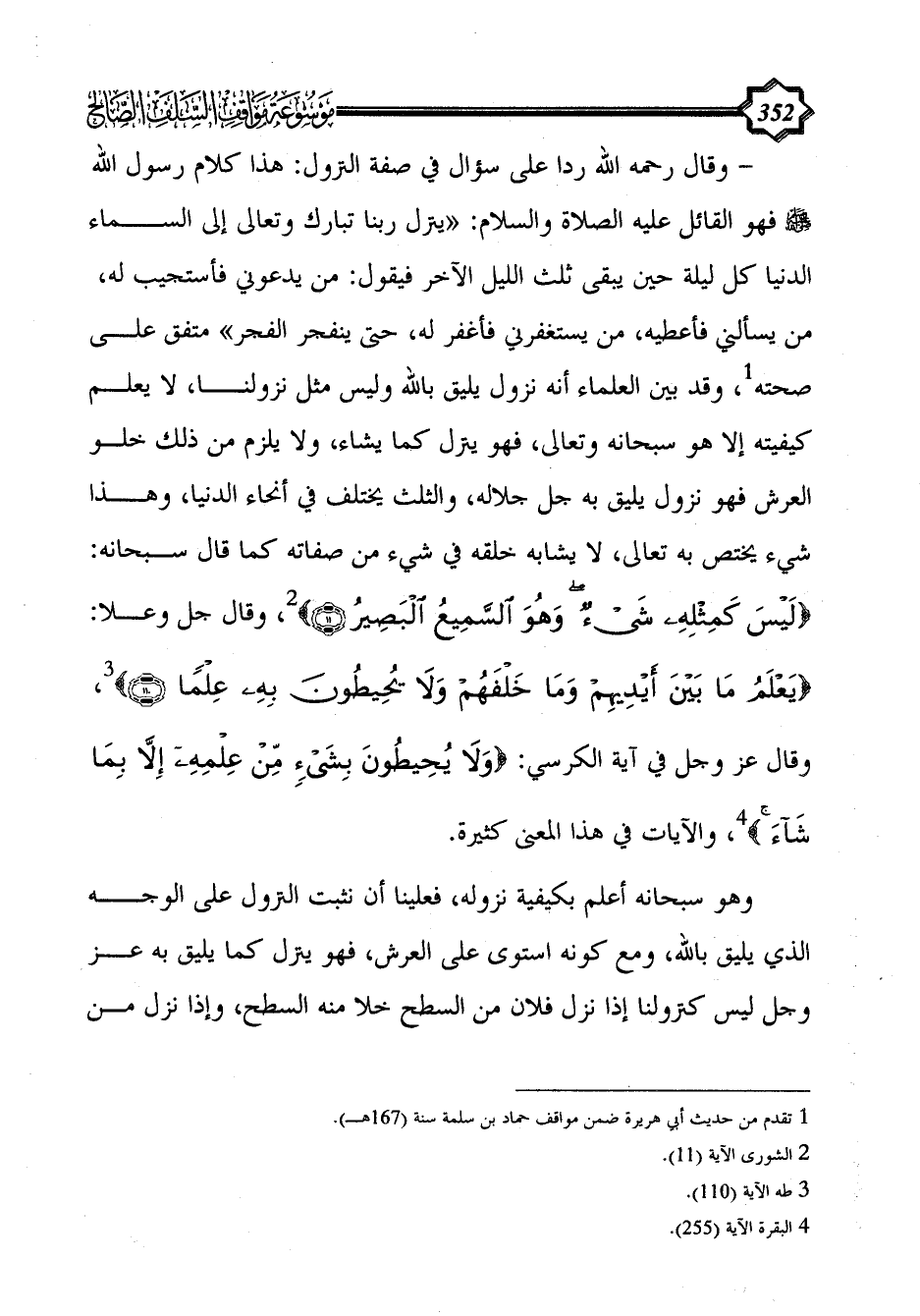 - وقال رحمه الله ردا على سؤال في صفة النزول: هذا كلام رسول الله - صلى الله عليه وسلم - فهو القائل عليه الصلاة والسلام: «ينزل ربنا تبارك وتعالى إلى السماء الدنيا كل ليلة حين يبقى ثلث الليل الآخر فيقول: من يدعوني فأستجيب له، من يسألني فأعطيه، من يستغفرني فأغفر له، حتى ينفجر الفجر» متفق على صحته (¬1)، وقد بين العلماء أنه نزول يليق بالله وليس مثل نزولنا، لا يعلم كيفيته إلا هو سبحانه وتعالى، فهو ينزل كما يشاء، ولا يلزم من ذلك خلو العرش فهو نزول يليق به جل جلاله، والثلث يختلف في أنحاء الدنيا، وهذا شيء يختص به تعالى، لا يشابه خلقه في شيء من صفاته كما قال سبحانه: {لَيْسَ كَمِثْلِهِ شَيْءٌ وَهُوَ السَّمِيعُ الْبَصِيرُ (11)} (¬2)، وقال جل وعلا: {يَعْلَمُ مَا بَيْنَ أَيْدِيهِمْ وَمَا خَلْفَهُمْ وَلَا يُحِيطُونَ بِهِ عِلْمًا (110)} (¬3)، وقال عز وجل في آية الكرسي: {وَلَا يُحِيطُونَ بِشَيْءٍ مِنْ عِلْمِهِ إِلَّا بِمَا شَاءَ} (¬4)، والآيات في هذا المعنى كثيرة.