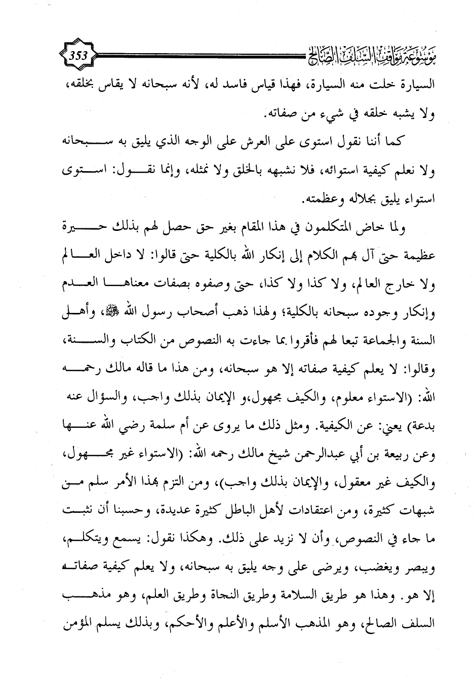 ولما خاض المتكلمون في هذا المقام بغير حق حصل لهم بذلك حيرة عظيمة حتى آل بهم الكلام إلى إنكار الله بالكلية حتى قالوا: لا داخل العالم ولا خارج العالم، ولا كذا ولا كذا، حتى وصفوه بصفات معناها العدم وإنكار وجوده سبحانه بالكلية؛ ولهذا ذهب أصحاب رسول الله - صلى الله عليه وسلم -، وأهل السنة والجماعة تبعا لهم فأقروا بما جاءت به النصوص من الكتاب والسنة، وقالوا: لا يعلم كيفية صفاته إلا هو سبحانه، ومن هذا ما قاله مالك رحمه الله: (الاستواء معلوم، والكيف مجهول، والإيمان بذلك واجب، والسؤال عنه بدعة) يعني: عن الكيفية. ومثل ذلك ما يروى عن أم سلمة رضي الله عنها وعن ربيعة بن أبي عبد الرحمن شيخ مالك رحمه الله: (الاستواء غير مجهول، والكيف غير معقول، والإيمان بذلك واجب)، ومن التزم بهذا الأمر سلم من شبهات كثيرة، ومن اعتقادات لأهل الباطل كثيرة عديدة، وحسبنا أن نثبت ما جاء في النصوص، وأن لا نزيد على ذلك. وهكذا نقول: يسمع ويتكلم، ويبصر ويغضب، ويرضى على وجه يليق به سبحانه، ولا يعلم كيفية صفاته إلا هو. وهذا هو طريق السلامة وطريق النجاة وطريق العلم، وهو مذهب السلف الصالح، وهو المذهب الأسلم والأعلم والأحكم، وبذلك يسلم المؤمن