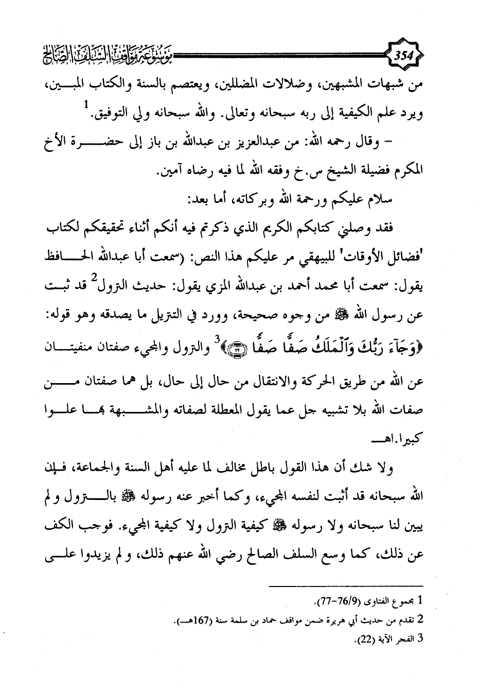 فقد وصلني كتابكم الكريم الذي ذكرتم فيه أنكم أثناء تحقيقكم لكتاب 'فضائل الأوقات' للبيهقي مر عليكم هذا النص: (سمعت أبا عبد الله الحافظ يقول: سمعت أبا محمد أحمد بن عبد الله المزي يقول: حديث النزول (¬2) قد ثبت عن رسول الله - صلى الله عليه وسلم - من وجوه صحيحة، وورد في التنزيل ما يصدقه وهو قوله: {وَجَاءَ رَبُّكَ وَالْمَلَكُ صَفًّا صَفًّا (22)} (¬3) والنزول والمجيء صفتان منفيتان عن الله من طريق الحركة والانتقال من حال إلى حال، بل هما صفتان من صفات الله بلا تشبيه جل عما يقول المعطلة لصفاته والمشبهة بها علوا كبيرا. اهـ