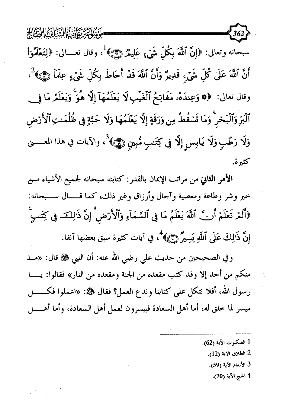 سبحانه وتعالى: {إِنَّ اللَّهَ بِكُلِّ شَيْءٍ عَلِيمٌ (62)} (¬1)، وقال تعالى: {لِتَعْلَمُوا أَنَّ اللَّهَ عَلَى كُلِّ شَيْءٍ قَدِيرٌ وَأَنَّ اللَّهَ قَدْ أَحَاطَ بِكُلِّ شَيْءٍ عِلْمًا (12)} (¬2)، وقال تعالى: {* وَعِنْدَهُ مَفَاتِحُ الْغَيْبِ لَا يَعْلَمُهَا إِلَّا هُوَ وَيَعْلَمُ مَا فِي الْبَرِّ وَالْبَحْرِ وَمَا تَسْقُطُ مِنْ وَرَقَةٍ إِلَّا يَعْلَمُهَا وَلَا حَبَّةٍ فِي ظُلُمَاتِ الْأَرْضِ وَلَا رَطْبٍ وَلَا يَابِسٍ إِلَّا فِي كِتَابٍ مُبِينٍ (59)} (¬3)، والآيات في هذا المعنى كثيرة.