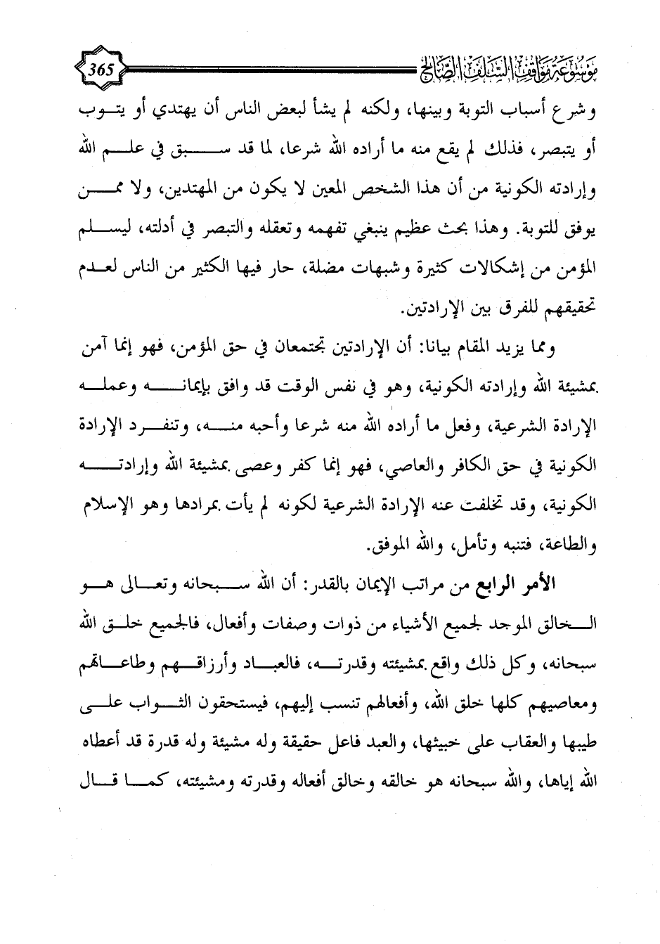 وشرع أسباب التوبة وبينها، ولكنه لم يشأ لبعض الناس أن يهتدي أو يتوب أو يتبصر، فذلك لم يقع منه ما أراده الله شرعا، لما قد سبق في علم الله وإرادته الكونية من أن هذا الشخص المعين لا يكون من المهتدين، ولا ممن يوفق للتوبة. وهذا بحث عظيم ينبغي تفهمه وتعقله والتبصر في أدلته، ليسلم المؤمن من إشكالات كثيرة وشبهات مضلة، حار فيها الكثير من الناس لعدم تحقيقهم للفرق بين الإرادتين.