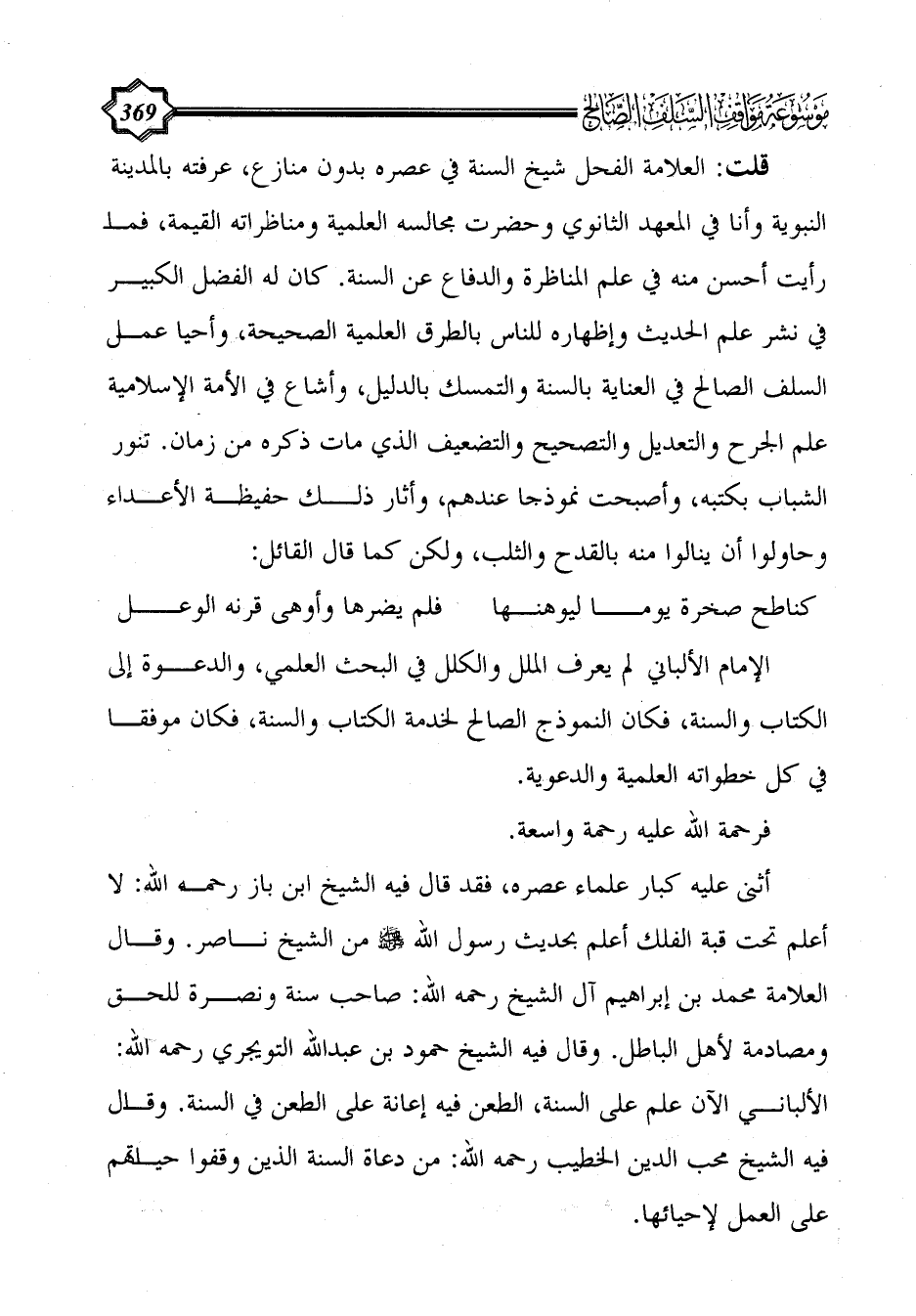 قلت: العلامة الفحل شيخ السنة في عصره بدون منازع، عرفته بالمدينة النبوية وأنا في المعهد الثانوي وحضرت مجالسه العلمية ومناظراته القيمة، فما رأيت أحسن منه في علم المناظرة والدفاع عن السنة. كان له الفضل الكبير في نشر علم الحديث وإظهاره للناس بالطرق العلمية الصحيحة، وأحيا عمل السلف الصالح في العناية بالسنة والتمسك بالدليل، وأشاع في الأمة الإسلامية علم الجرح والتعديل والتصحيح والتضعيف الذي مات ذكره من زمان. تنور الشباب بكتبه، وأصبحت نموذجا عندهم، وأثار ذلك حفيظة الأعداء وحاولوا أن ينالوا منه بالقدح والثلب، ولكن كما قال القائل:
