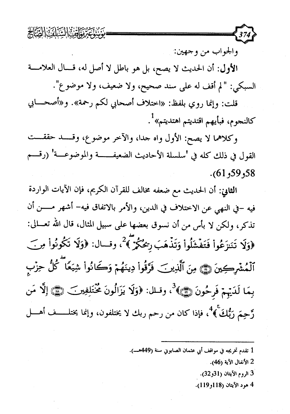الثاني: أن الحديث مع ضعفه مخالف للقرآن الكريم، فإن الآيات الواردة فيه -في النهي عن الاختلاف في الدين، والأمر بالاتفاق فيه- أشهر من أن تذكر، ولكن لا بأس من أن نسوق بعضها على سبيل المثال، قال الله تعالى: {وَلَا تَنَازَعُوا فَتَفْشَلُوا وَتَذْهَبَ رِيحُكُمْ} (¬2)، وقال: {وَلَا تَكُونُوا مِنَ الْمُشْرِكِينَ (31) مِنَ الَّذِينَ فَرَّقُوا دِينَهُمْ وَكَانُوا شِيَعًا كُلُّ حِزْبٍ بِمَا لَدَيْهِمْ فَرِحُونَ (32)} (¬3)، وقال: {وَلَا يَزَالُونَ مُخْتَلِفِينَ (118) إِلَّا مَنْ رَحِمَ رَبُّكَ} (¬4)، فإذا كان من رحم ربك لا يختلفون، وإنما يختلف أهل
