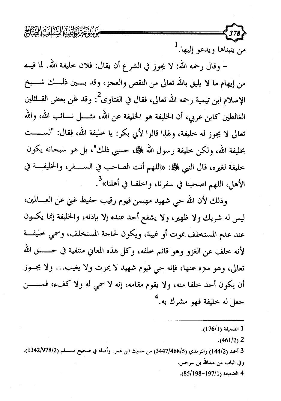 - وقال رحمه الله: لا يجوز في الشرع أن يقال: فلان خليفة الله. لما فيه من إيهام ما لا يليق بالله تعالى من النقص والعجز، وقد بين ذلك شيخ الإسلام ابن تيمية رحمه الله تعالى، فقال في الفتاوى (¬2): وقد ظن بعض القائلين الغالطين كابن عربي، أن الخليفة هو الخليفة عن الله، مثل نائب الله، والله تعالى لا يجوز له خليفة، ولهذا قالوا لأبي بكر: يا خليفة الله، فقال: "لست بخليفة الله، ولكن خليفة رسول الله - صلى الله عليه وسلم -، حسبي ذلك"، بل هو سبحانه يكون خليفة لغيره، قال النبي - صلى الله عليه وسلم -: «اللهم أنت الصاحب في السفر، والخليفة في الأهل، اللهم اصحبنا في سفرنا، واخلفنا في أهلنا» (¬3).