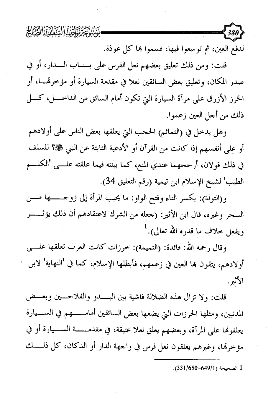قلت: ولا تزال هذه الضلالة فاشية بين البدو والفلاحين وبعض المدنيين، ومثلها الخرزات التي يضعها بعض السائقين أمامهم في السيارة يعلقونها على المرآة، وبعضهم يعلق نعلا عتيقة، في مقدمة السيارة أو في مؤخرتها، وغيرهم يعلقون نعل فرس في واجهة الدار أو الدكان، كل ذلك