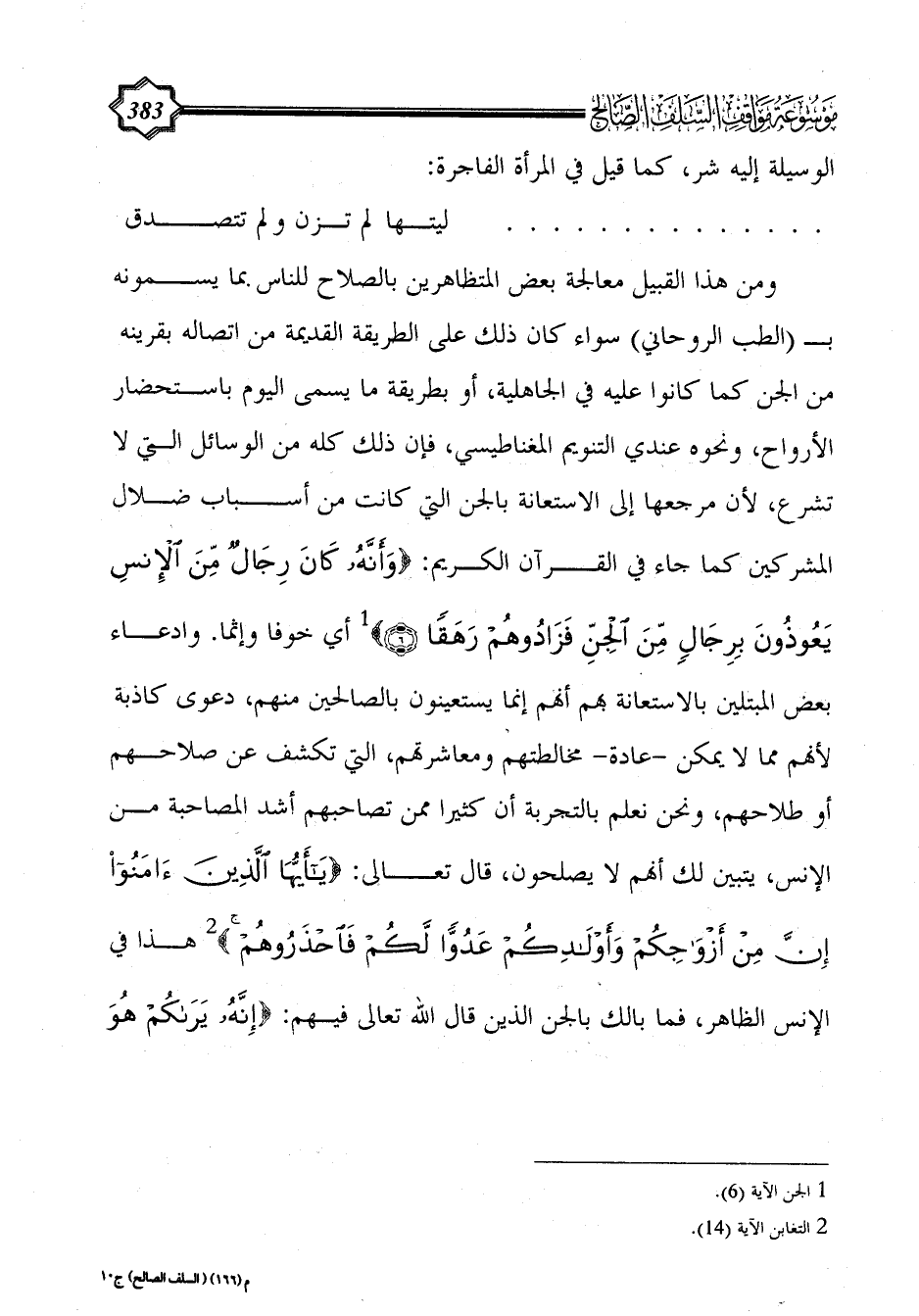 ومن هذا القبيل معالجة بعض المتظاهرين بالصلاح للناس بما يسمونه بـ (الطب الروحاني) سواء كان ذلك على الطريقة القديمة من اتصاله بقرينه من الجن كما كانوا عليه في الجاهلية، أو بطريقة ما يسمى اليوم باستحضار الأرواح، ونحوه عندي التنويم المغناطيسي، فإن ذلك كله من الوسائل التي لا تشرع، لأن مرجعها إلى الاستعانة بالجن التي كانت من أسباب ضلال المشركين كما جاء في القرآن الكريم: {وَأَنَّهُ كَانَ رِجَالٌ مِنَ الْإِنْسِ يَعُوذُونَ بِرِجَالٍ مِنَ الْجِنِّ فَزَادُوهُمْ رَهَقًا (6)} (¬1) أي خوفا وإثما. وادعاء بعض المبتلين بالاستعانة بهم أنهم إنما يستعينون بالصالحين منهم، دعوى كاذبة لأنهم مما لا يمكن -عادة- مخالطتهم ومعاشرتهم، التي تكشف عن صلاحهم أو طلاحهم، ونحن نعلم بالتجربة أن كثيرا ممن تصاحبهم أشد المصاحبة من الإنس، يتبين لك أنهم لا يصلحون، قال تعالى: {يَا أَيُّهَا الَّذِينَ آَمَنُوا إِن مِنْ أَزْوَاجِكُمْ وَأَوْلَادِكُمْ عَدُوًّا لَكُمْ فَاحْذَرُوهُمْ} (¬2) هذا في الإنس الظاهر، فما بالك بالجن الذين قال الله تعالى فيهم: {إِنَّهُ يَرَاكُمْ هُوَ