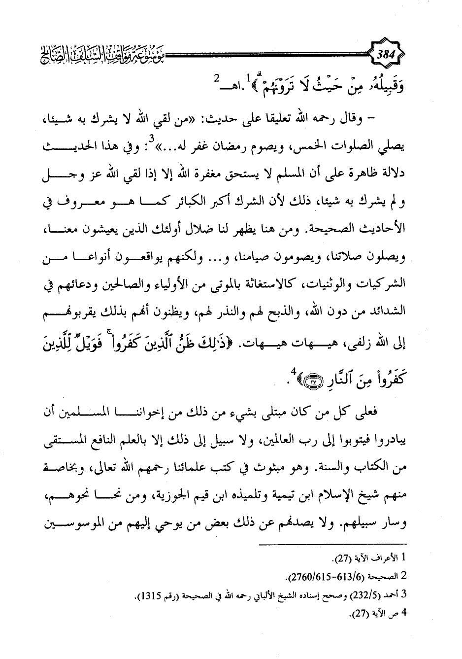 - وقال رحمه الله تعليقا على حديث: «من لقي الله لا يشرك به شيئا، يصلي الصلوات الخمس، ويصوم رمضان غفر له ... » (¬3): وفي هذا الحديث دلالة ظاهرة على أن المسلم لا يستحق مغفرة الله إلا إذا لقي الله عز وجل ولم يشرك به شيئا، ذلك لأن الشرك أكبر الكبائر كما هو معروف في الأحاديث الصحيحة. ومن هنا يظهر لنا ضلال أولئك الذين يعيشون معنا، ويصلون صلاتنا، ويصومون صيامنا، و ... ولكنهم يواقعون أنواعا من الشركيات والوثنيات، كالاستغاثة بالموتى من الأولياء والصالحين ودعائهم في الشدائد من دون الله، والذبح لهم والنذر لهم، ويظنون أنهم بذلك يقربونهم إلى الله زلفى، هيهات هيهات. {ذَلِكَ ظَنُّ الَّذِينَ كَفَرُوا فَوَيْلٌ لِلَّذِينَ كَفَرُوا مِنَ النَّارِ (27)} (¬4).