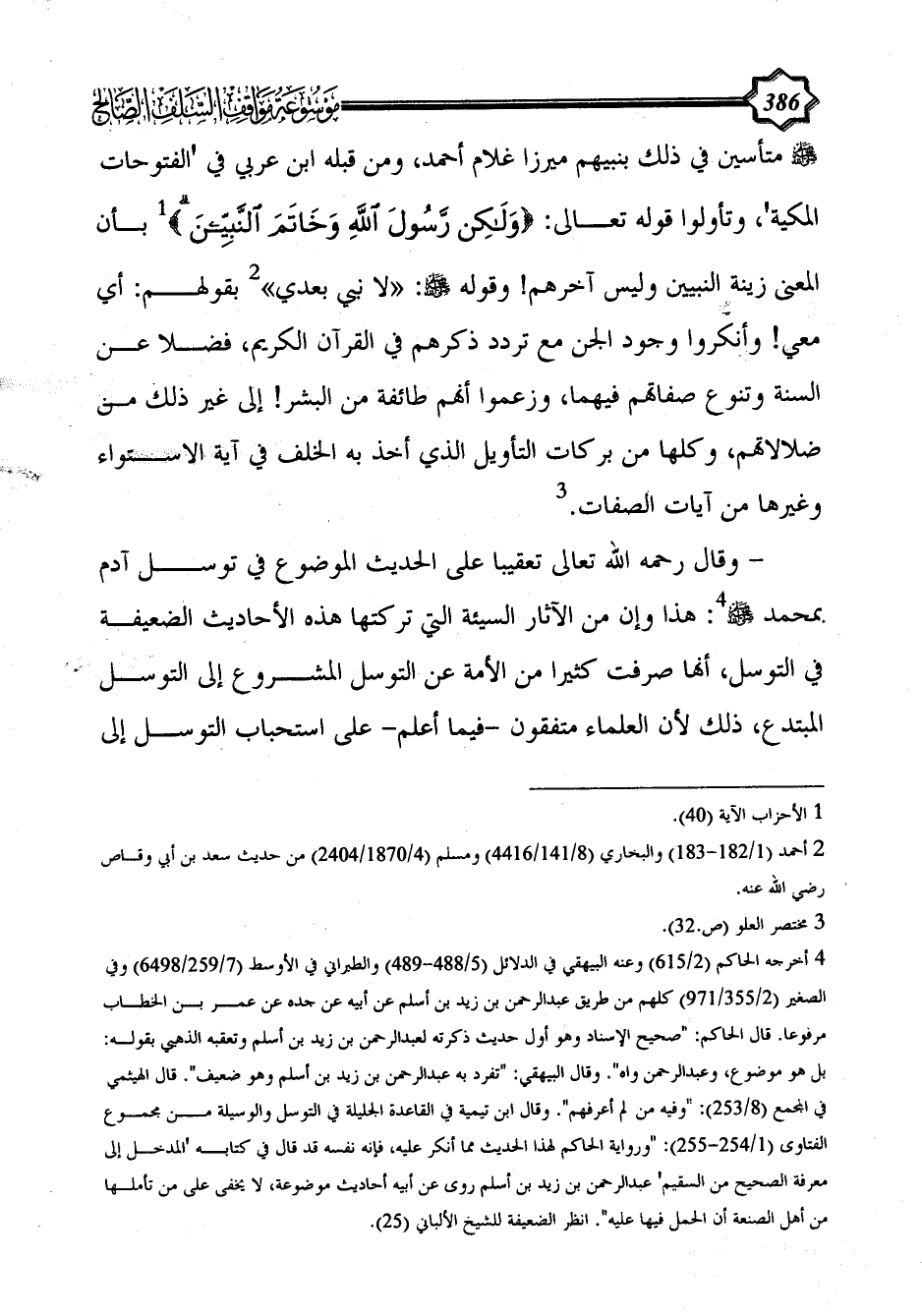 - صلى الله عليه وسلم - متأسين في ذلك بنبيهم ميرزا غلام أحمد، ومن قبله ابن عربي في 'الفتوحات المكية'، وتأولوا قوله تعالى: {وَلَكِنْ رَسُولَ اللَّهِ وَخَاتَمَ النَّبِيِّينَ} (¬1) بأن المعنى زينة النبيين وليس آخرهم! وقوله - صلى الله عليه وسلم -: «لا نبي بعدي» (¬2) بقولهم: أي معي! وأنكروا وجود الجن مع تردد ذكرهم في القرآن الكريم، فضلا عن السنة وتنوع صفاتهم فيهما، وزعموا أنهم طائفة من البشر! إلى غير ذلك من ضلالاتهم، وكلها من بركات التأويل الذي أخذ به الخلف في آية الاستواء وغيرها من آيات الصفات. (¬3)