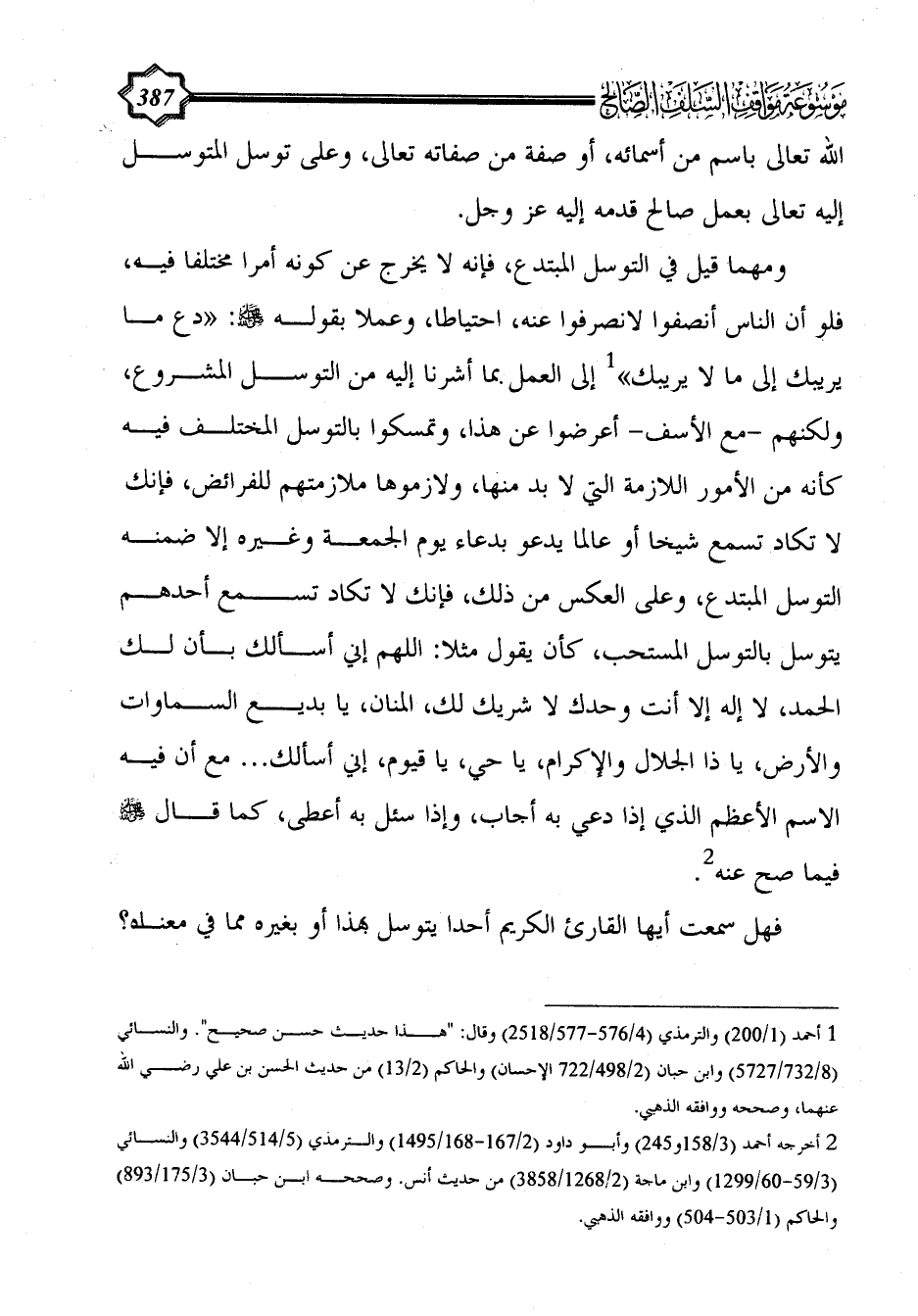 ومهما قيل في التوسل المبتدع، فإنه لا يخرج عن كونه أمرا مختلفا فيه، فلو أن الناس أنصفوا لانصرفوا عنه، احتياطا، وعملا بقوله - صلى الله عليه وسلم -: «دع ما يريبك إلى ما لا يريبك» (¬1) إلى العمل بما أشرنا إليه من التوسل المشروع، ولكنهم -مع الأسف- أعرضوا عن هذا، وتمسكوا بالتوسل المختلف فيه كأنه من الأمور اللازمة التي لا بد منها، ولازموها ملازمتهم للفرائض، فإنك لا تكاد تسمع شيخا أو عالما يدعو بدعاء يوم الجمعة وغيره إلا ضمنه التوسل المبتدع، وعلى العكس من ذلك، فإنك لا تكاد تسمع أحدهم يتوسل بالتوسل المستحب، كأن يقول مثلا: اللهم إني أسألك بأن لك الحمد، لا إله إلا أنت وحدك لا شريك لك، المنان، يا بديع السماوات والأرض، يا ذا الجلال والإكرام، يا حي، يا قيوم، إني أسألك ... مع أن فيه الاسم الأعظم الذي إذا دعي به أجاب، وإذا سئل به أعطى، كما قال - صلى الله عليه وسلم - فيما صح عنه (¬2).