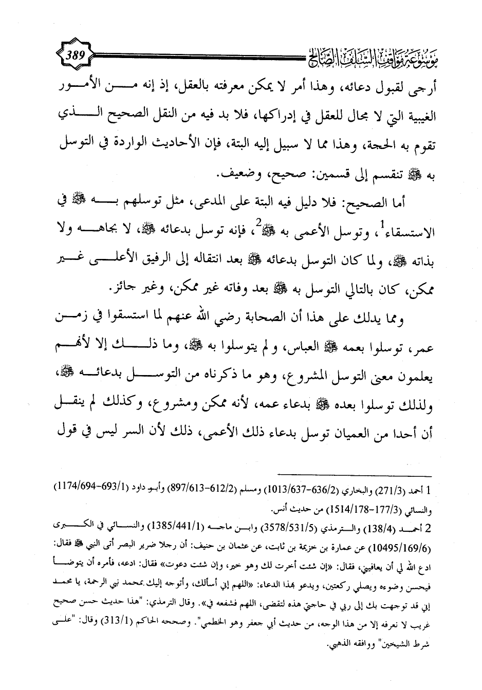 أما الصحيح: فلا دليل فيه البتة على المدعى، مثل توسلهم به - صلى الله عليه وسلم - في الاستسقاء (¬1)، وتوسل الأعمى به - صلى الله عليه وسلم - (¬2)، فإنه توسل بدعائه - صلى الله عليه وسلم -، لا بجاهه ولا بذاته - صلى الله عليه وسلم -، ولما كان التوسل بدعائه - صلى الله عليه وسلم - بعد انتقاله إلى الرفيق الأعلى غير ممكن، كان بالتالي التوسل به - صلى الله عليه وسلم - بعد وفاته غير ممكن، وغير جائز.