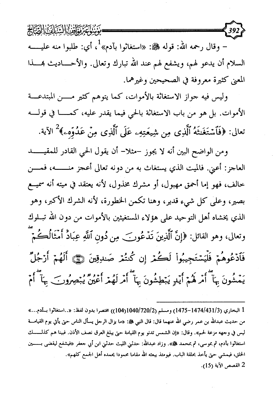 وليس فيه جواز الاستغاثة بالأموات، كما يتوهم كثير من المبتدعة الأموات. بل هو من باب الاستغاثة بالحي فيما يقدر عليه، كما في قوله تعالى: {فَاسْتَغَاثَهُ الَّذِي مِنْ شِيعَتِهِ عَلَى الَّذِي مِنْ عَدُوِّهِ} (¬2) الآية.