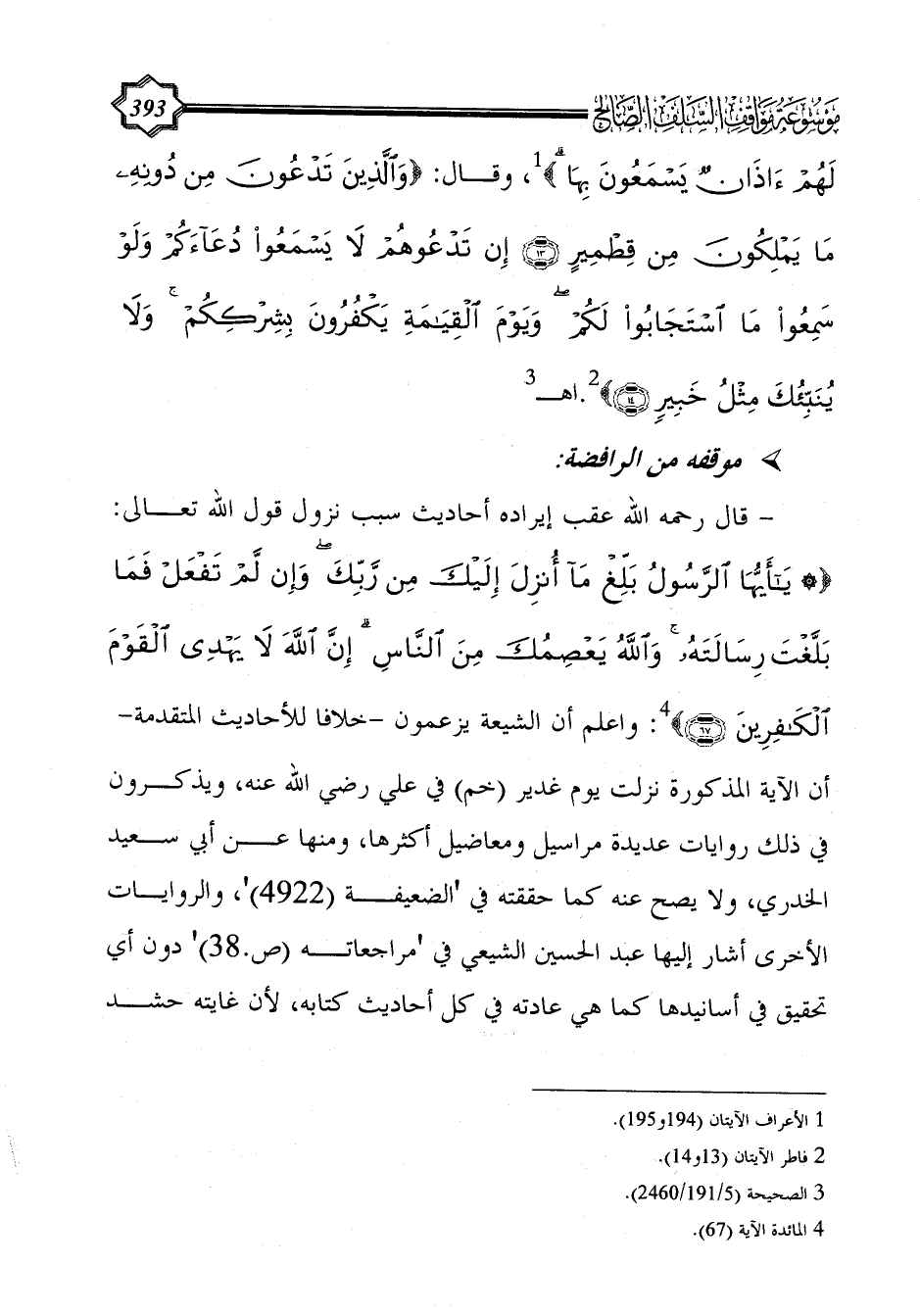 - قال رحمه الله عقب إيراده أحاديث سبب نزول قول الله تعالى: {* يَا أَيُّهَا الرَّسُولُ بَلِّغْ مَا أُنْزِلَ إِلَيْكَ مِنْ رَبِّكَ وَإِنْ لَمْ تَفْعَلْ فَمَا بَلَّغْتَ رِسَالَتَهُ وَاللَّهُ يَعْصِمُكَ مِنَ النَّاسِ إِنَّ اللَّهَ لَا يَهْدِي الْقَوْمَ الْكَافِرِينَ (67)} (¬4): واعلم أن الشيعة يزعمون -خلافا للأحاديث المتقدمة- أن الآية المذكورة نزلت يوم غدير (خم) في علي رضي الله عنه، ويذكرون في ذلك روايات عديدة مراسيل ومعاضيل أكثرها، ومنها عن أبي سعيد الخدري، ولا يصح عنه كما حققته في 'الضعيفة (4922) '، والروايات الأخرى أشار إليها عبد الحسين الشيعي في 'مراجعاته (ص.38) ' دون أي تحقيق في أسانيدها كما هي عادته في كل أحاديث كتابه، لأن غايته حشد