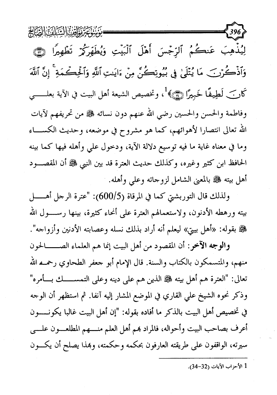 لِيُذْهِبَ عَنْكُمُ الرِّجْسَ أَهْلَ الْبَيْتِ وَيُطَهِّرَكُمْ تَطْهِيرًا (33) وَاذْكُرْنَ مَا يُتْلَى فِي بُيُوتِكُنَّ مِنْ آَيَاتِ اللَّهِ وَالْحِكْمَةِ إِنَّ اللَّهَ كَانَ لَطِيفًا خَبِيرًا (34)} (¬1)، وتخصيص الشيعة أهل البيت في الآية بعلي وفاطمة والحسن والحسين رضي الله عنهم دون نسائه - صلى الله عليه وسلم - من تحريفهم لآيات الله تعالى انتصارا لأهوائهم، كما هو مشروح في موضعه، وحديث الكساء وما في معناه غاية ما فيه توسيع دلالة الآية، ودخول علي وأهله فيها كما بينه الحافظ ابن كثير وغيره، وكذلك حديث العترة قد بين النبي - صلى الله عليه وسلم - أن المقصود أهل بيته - صلى الله عليه وسلم - بالمعنى الشامل لزوجاته وعلي وأهله.