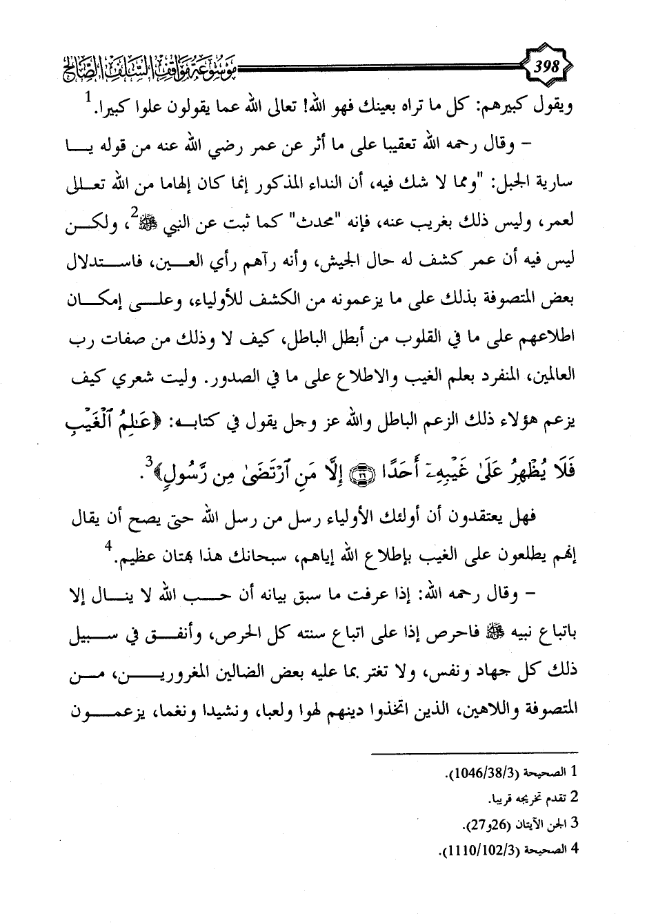 - وقال رحمه الله تعقيبا على ما أثر عن عمر رضي الله عنه من قوله يا سارية الجبل: "ومما لا شك فيه، أن النداء المذكور إنما كان إلهاما من الله تعالى لعمر، وليس ذلك بغريب عنه، فإنه "محدث" كما ثبت عن النبي - صلى الله عليه وسلم - (¬2)، ولكن ليس فيه أن عمر كشف له حال الجيش، وأنه رآهم رأي العين، فاستدلال بعض المتصوفة بذلك على ما يزعمونه من الكشف للأولياء، وعلى إمكان اطلاعهم على ما في القلوب من أبطل الباطل، كيف لا وذلك من صفات رب العالمين، المنفرد بعلم الغيب والاطلاع على ما في الصدور. وليت شعري كيف يزعم هؤلاء ذلك الزعم الباطل والله عز وجل يقول في كتابه: {عَالِمُ الْغَيْبِ فَلَا يُظْهِرُ عَلَى غَيْبِهِ أَحَدًا (26) إِلَّا مَنِ ارْتَضَى مِنْ رَسُولٍ} (¬3).