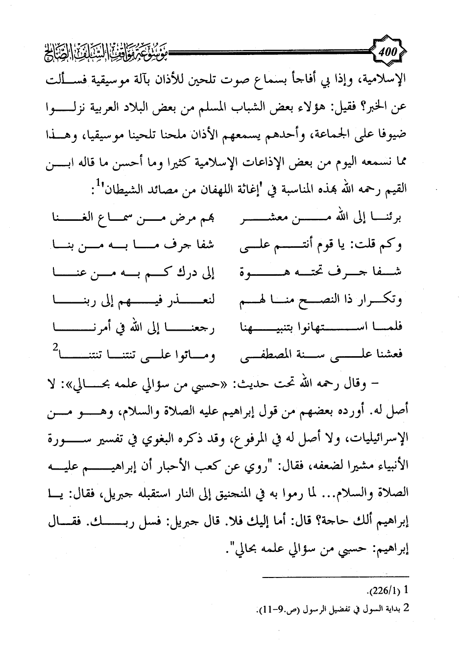 الإسلامية، وإذا بي أفاجأ بسماع صوت تلحين للأذان بآلة موسيقية فسألت عن الخبر؟ فقيل: هؤلاء بعض الشباب المسلم من بعض البلاد العربية نزلوا ضيوفا على الجماعة، وأحدهم يسمعهم الأذان ملحنا تلحينا موسيقيا، وهذا مما نسمعه اليوم من بعض الإذاعات الإسلامية كثيرا وما أحسن ما قاله ابن القيم رحمه الله بهذه المناسبة في 'إغاثة اللهفان من مصائد الشيطان' (¬1):