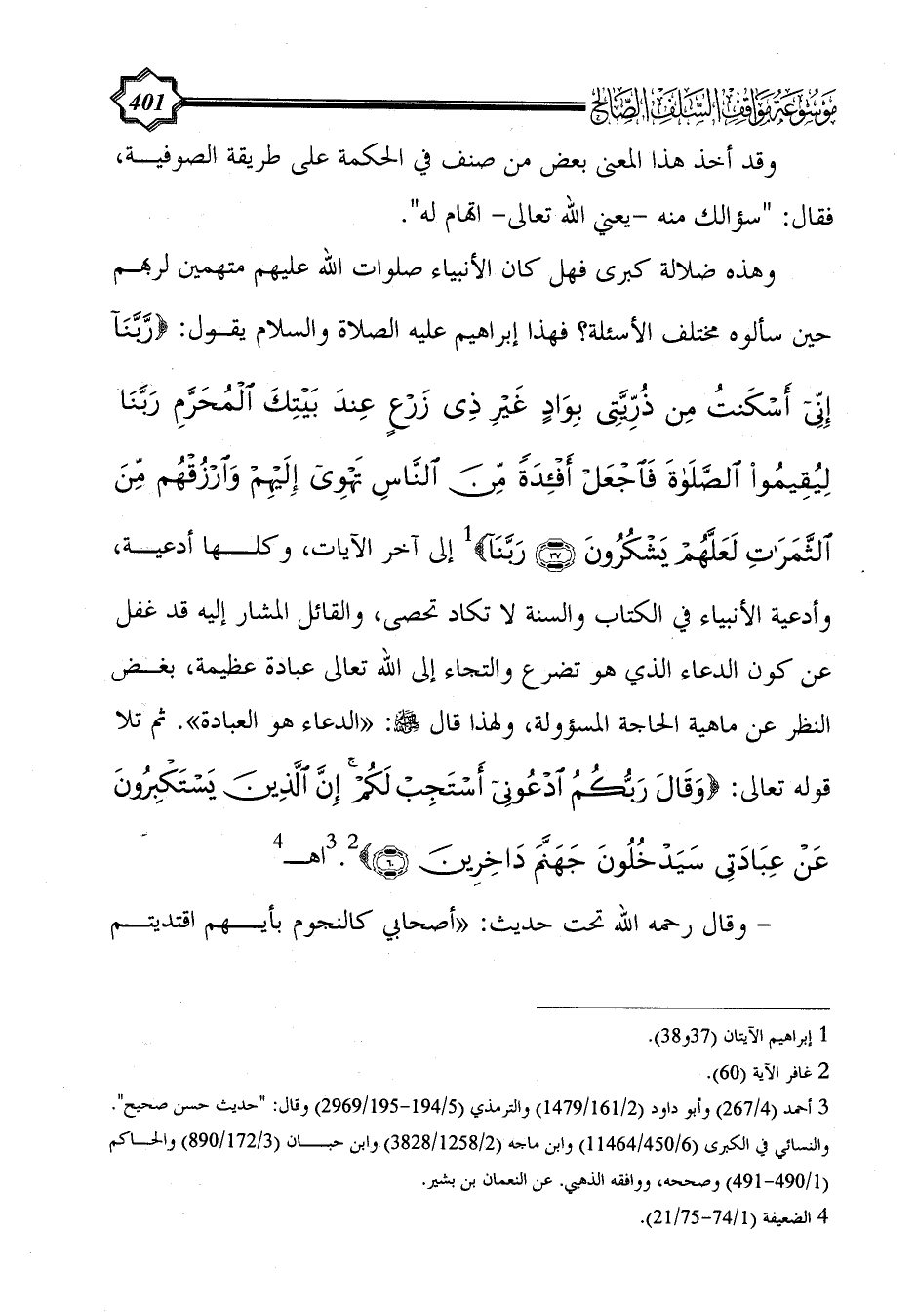 وهذه ضلالة كبرى فهل كان الأنبياء صلوات الله عليهم متهمين لربهم حين سألوه مختلف الأسئلة؟ فهذا إبراهيم عليه الصلاة والسلام يقول: {رَبَّنَا إِنِّي أَسْكَنْتُ مِنْ ذُرِّيَّتِي بِوَادٍ غَيْرِ ذِي زَرْعٍ عِنْدَ بَيْتِكَ الْمُحَرَّمِ رَبَّنَا لِيُقِيمُوا الصَّلَاةَ فَاجْعَلْ أَفْئِدَةً مِنَ النَّاسِ تَهْوِي إِلَيْهِمْ وَارْزُقْهُمْ مِنَ الثَّمَرَاتِ لَعَلَّهُمْ يَشْكُرُونَ (37) رَبَّنَا} (¬1) إلى آخر الآيات، وكلها أدعية، وأدعية الأنبياء في الكتاب والسنة لا تكاد تحصى، والقائل المشار إليه قد غفل عن كون الدعاء الذي هو تضرع والتجاء إلى الله تعالى عبادة عظيمة، بغض النظر عن ماهية الحاجة المسؤولة، ولهذا قال - صلى الله عليه وسلم -: «الدعاء هو العبادة». ثم تلا قوله تعالى: {وَقَالَ رَبُّكُمُ ادْعُونِي أَسْتَجِبْ لَكُمْ إِنَّ الَّذِينَ يَسْتَكْبِرُونَ عَنْ عِبَادَتِي سَيَدْخُلُونَ جَهَنَّمَ دَاخِرِينَ (60)} (¬2). (¬3) اهـ (¬4)