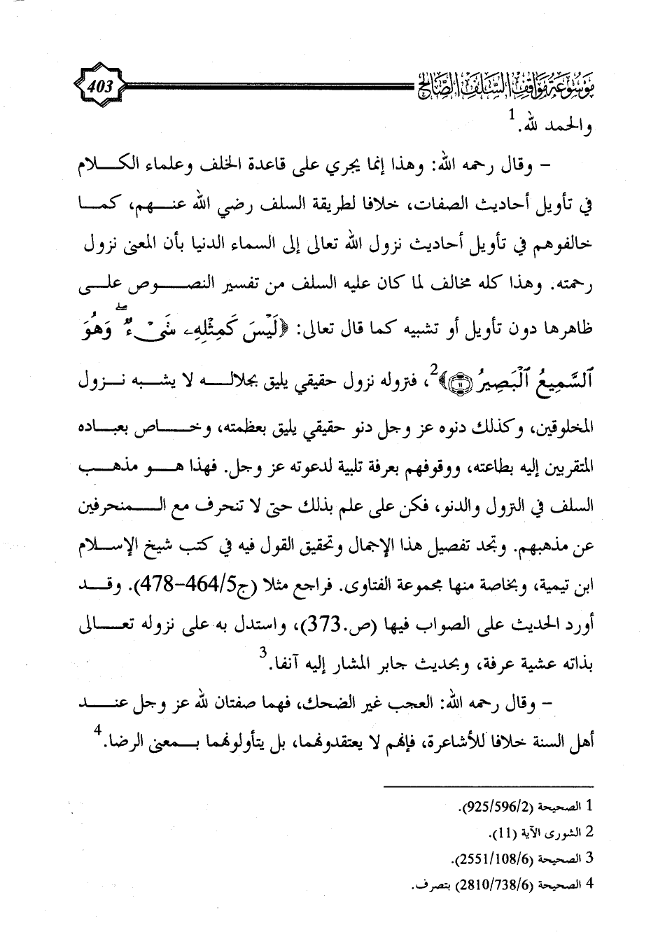 - وقال رحمه الله: وهذا إنما يجري على قاعدة الخلف وعلماء الكلام في تأويل أحاديث الصفات، خلافا لطريقة السلف رضي الله عنهم، كما خالفوهم في تأويل أحاديث نزول الله تعالى إلى السماء الدنيا بأن المعنى نزول رحمته. وهذا كله مخالف لما كان عليه السلف من تفسير النصوص على ظاهرها دون تأويل أو تشبيه كما قال تعالى: {لَيْسَ كَمِثْلِهِ شَيْءٌ وَهُوَ السَّمِيعُ الْبَصِيرُ (11)} (¬2)، فنزوله نزول حقيقي يليق بجلاله لا يشبه نزول المخلوقين، وكذلك دنوه عز وجل دنو حقيقي يليق بعظمته، وخاص بعباده المتقربين إليه بطاعته، ووقوفهم بعرفة تلبية لدعوته عز وجل. فهذا هو مذهب السلف في النزول والدنو، فكن على علم بذلك حتى لا تنحرف مع المنحرفين عن مذهبهم. وتجد تفصيل هذا الإجمال وتحقيق القول فيه في كتب شيخ الإسلام ابن تيمية، وبخاصة منها مجموعة الفتاوى. فراجع مثلا (ج5/ 464 - 478). وقد أورد الحديث على الصواب فيها (ص.373)، واستدل به على نزوله تعالى بذاته عشية عرفة، وبحديث جابر المشار إليه آنفا. (¬3)