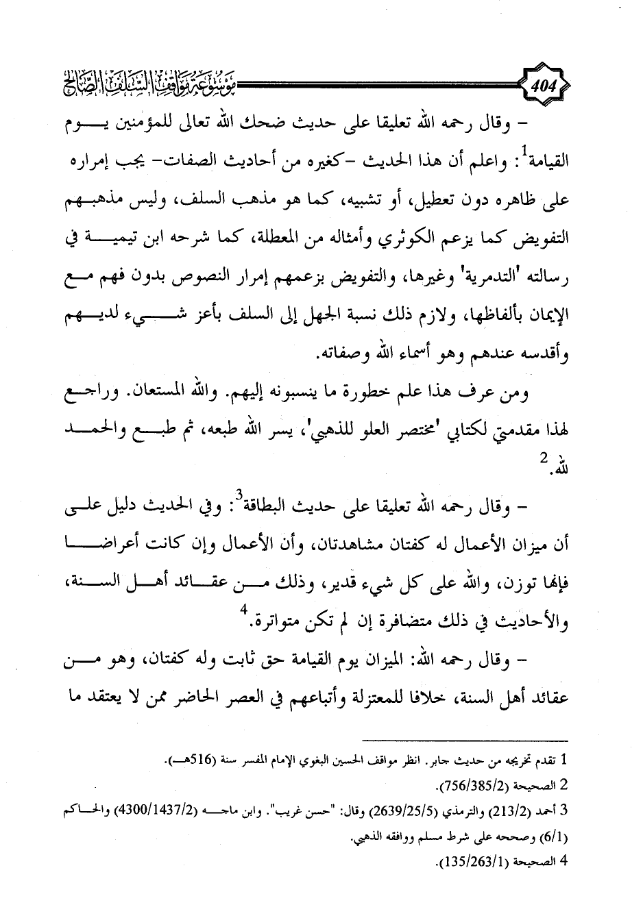 - وقال رحمه الله: الميزان يوم القيامة حق ثابت وله كفتان، وهو من عقائد أهل السنة، خلافا للمعتزلة وأتباعهم في العصر الحاضر ممن لا يعتقد ما