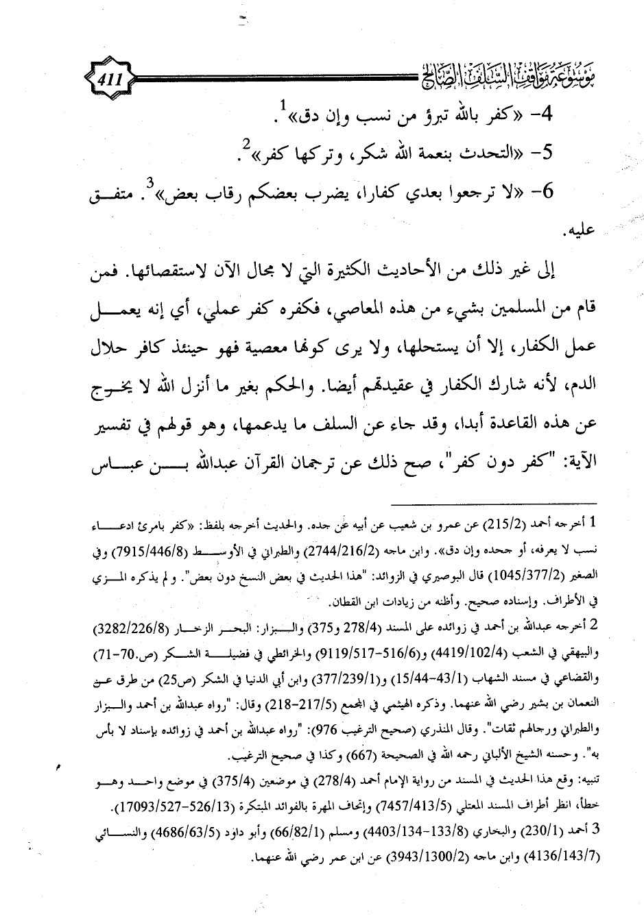 إلى غير ذلك من الأحاديث الكثيرة التي لا مجال الآن لاستقصائها. فمن قام من المسلمين بشيء من هذه المعاصي، فكفره كفر عملي، أي إنه يعمل عمل الكفار، إلا أن يستحلها، ولا يرى كونها معصية فهو حينئذ كافر حلال الدم، لأنه شارك الكفار في عقيدتهم أيضا. والحكم بغير ما أنزل الله يخرج عن هذه القاعدة أبدا، وقد جاء عن السلف ما يدعمها، وهو قولهم في تفسير الآية: "كفر دون كفر"، صح ذلك عن ترجمان القرآن عبد الله بن عباس