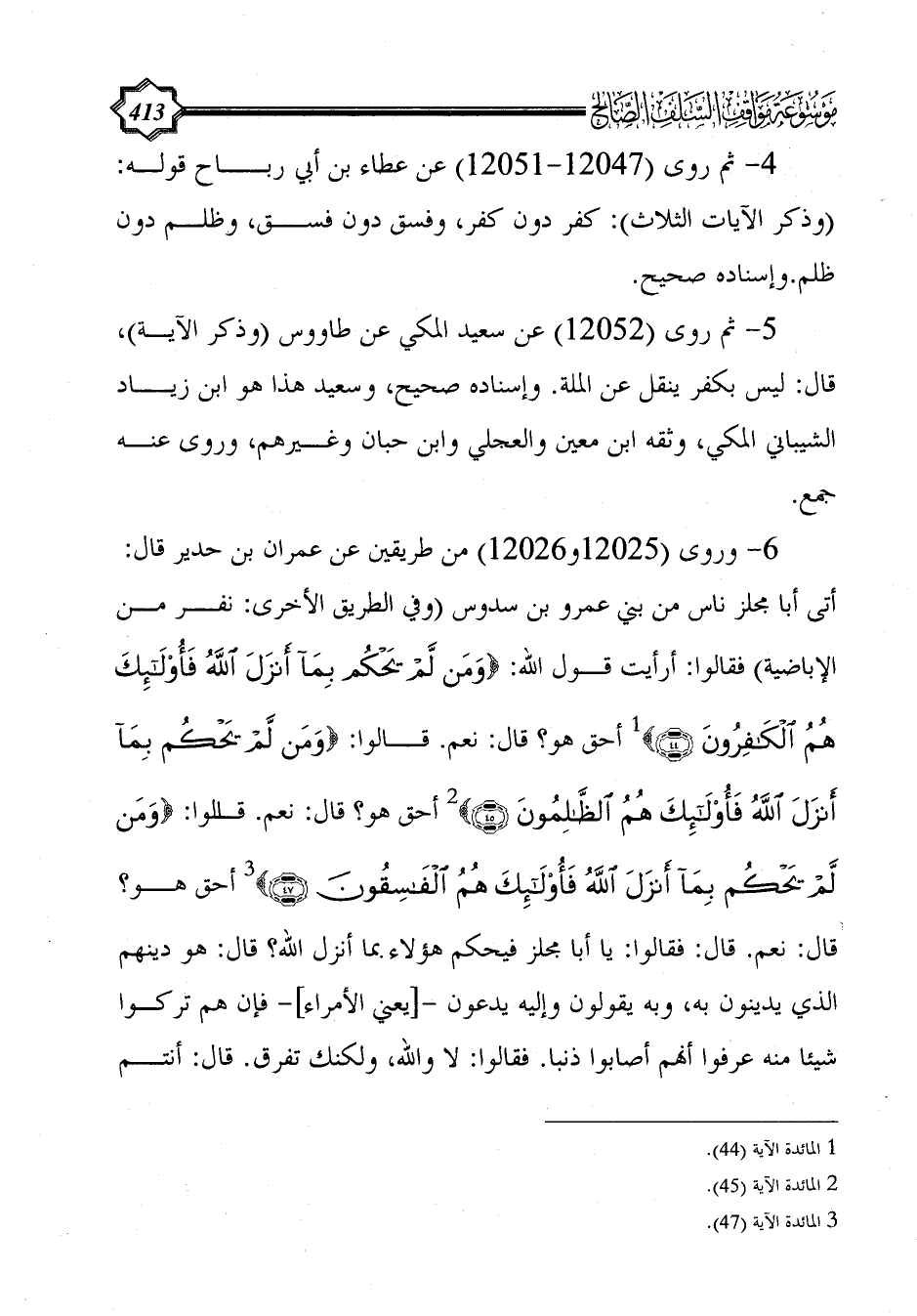 4 - ثم روى (12047 - 12051) عن عطاء بن أبي رباح قوله: (وذكر الآيات الثلاث): كفر دون كفر، وفسق دون فسق، وظلم دون ظلم. وإسناده صحيح.