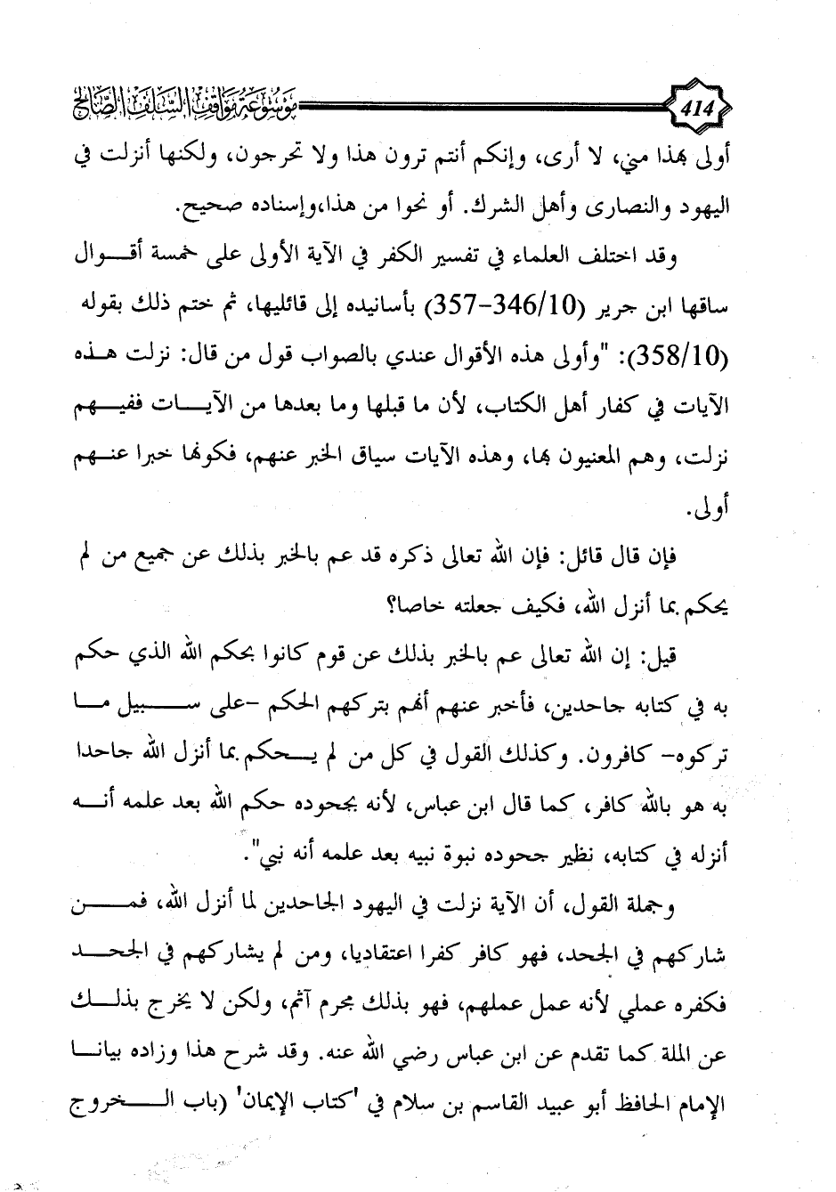 وجملة القول، أن الآية نزلت في اليهود الجاحدين لما أنزل الله، فمن شاركهم في الجحد، فهو كافر كفرا اعتقاديا، ومن لم يشاركهم في الجحد فكفره عملي لأنه عمل عملهم، فهو بذلك مجرم آثم، ولكن لا يخرج بذلك عن الملة كما تقدم عن ابن عباس رضي الله عنه. وقد شرح هذا وزاده بيانا الإمام الحافظ أبو عبيد القاسم بن سلام في 'كتاب الإيمان' (باب الخروج