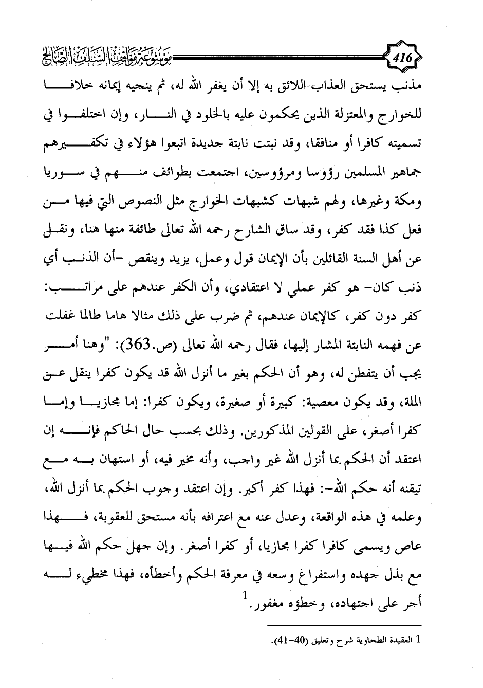 مذنب يستحق العذاب اللائق به إلا أن يغفر الله له، ثم ينجيه إيمانه خلافا للخوارج والمعتزلة الذين يحكمون عليه بالخلود في النار، وإن اختلفوا في تسميته كافرا أو منافقا، وقد نبتت نابتة جديدة اتبعوا هؤلاء في تكفيرهم جماهير المسلمين رؤوسا ومرؤوسين، اجتمعت بطوائف منهم في سوريا ومكة وغيرها، ولهم شبهات كشبهات الخوارج مثل النصوص التي فيها من فعل كذا فقد كفر، وقد ساق الشارح رحمه الله تعالى طائفة منها هنا، ونقل عن أهل السنة القائلين بأن الإيمان قول وعمل، يزيد وينقص -أن الذنب أي ذنب كان- هو كفر عملي لا اعتقادي، وأن الكفر عندهم على مراتب: كفر دون كفر، كالإيمان عندهم، ثم ضرب على ذلك مثالا هاما طالما غفلت عن فهمه النابتة المشار إليها، فقال رحمه الله تعالى (ص.363): "وهنا أمر يجب أن يتفطن له، وهو أن الحكم بغير ما أنزل الله قد يكون كفرا ينقل عن الملة، وقد يكون معصية: كبيرة أو صغيرة، ويكون كفرا: إما مجازيا وإما كفرا أصغر، على القولين المذكورين. وذلك بحسب حال الحاكم فإنه إن اعتقد أن الحكم بما أنزل الله غير واجب، وأنه مخير فيه، أو استهان به مع تيقنه أنه حكم الله-: فهذا كفر أكبر. وإن اعتقد وجوب الحكم بما أنزل الله، وعلمه في هذه الواقعة، وعدل عنه مع اعترافه بأنه مستحق للعقوبة، فهذا عاص ويسمى كافرا كفرا مجازيا، أو كفرا أصغر. وإن جهل حكم الله فيها مع بذل جهده واستفراغ وسعه في معرفة الحكم وأخطأه، فهذا مخطيء له أجر على اجتهاده، وخطؤه مغفور. (¬1)