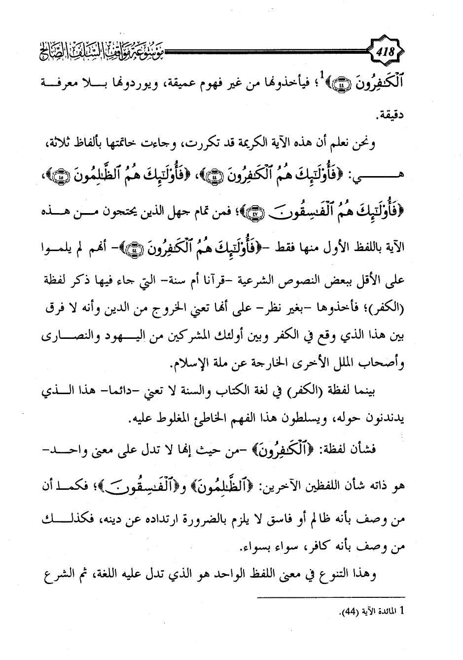 فشأن لفظة: {الكافرون} -من حيث إنها لا تدل على معنى واحد- هو ذاته شأن اللفظين الآخرين: {الظالمون} و {الفاسقون}؛ فكما أن من وصف بأنه ظالم أو فاسق لا يلزم بالضرورة ارتداده عن دينه، فكذلك من وصف بأنه كافر، سواء بسواء.
