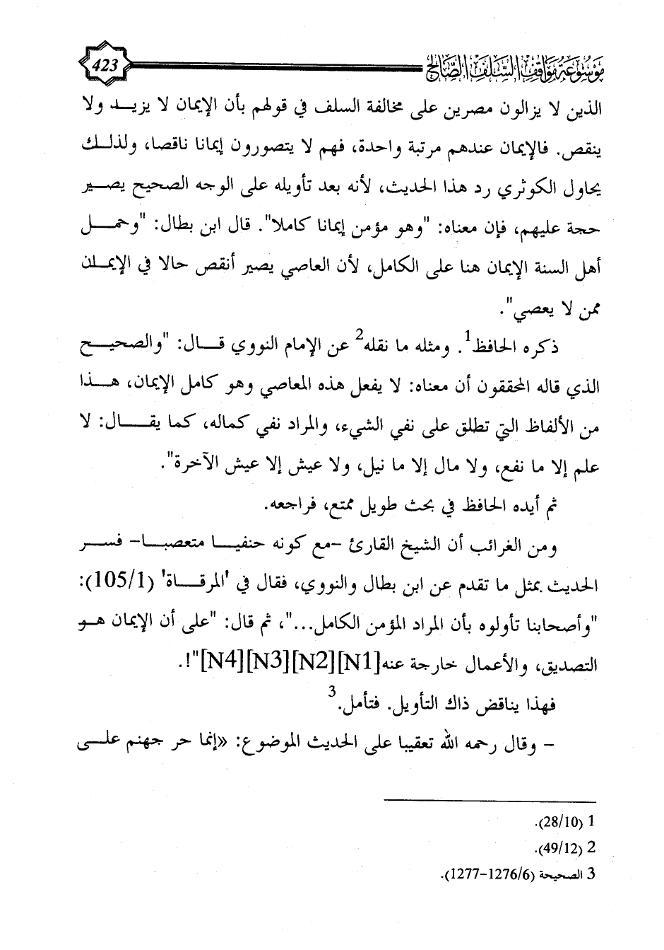 ذكره الحافظ (¬1). ومثله ما نقله (¬2) عن الإمام النووي قال: "والصحيح الذي قاله المحققون أن معناه: لا يفعل هذه المعاصي وهو كامل الإيمان، هذا من الألفاظ التي تطلق على نفي الشيء، والمراد نفي كماله، كما يقال: لا علم إلا ما نفع، ولا مال إلا ما نيل، ولا عيش إلا عيش الآخرة".