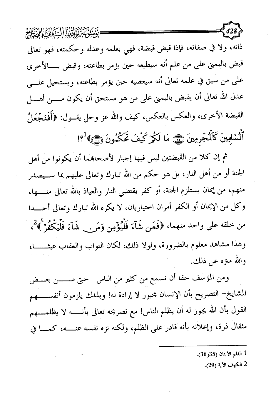 ومن المؤسف حقا أن نسمع من كثير من الناس -حتى من بعض المشايخ- التصريح بأن الإنسان مجبور لا إرادة له! وبذلك يلزمون أنفسهم القول بأن الله يجوز له أن يظلم الناس! مع تصريحه تعالى بأنه لا يظلمهم مثقال ذرة، وإعلانه بأنه قادر على الظلم، ولكنه نزه نفسه عنه، كما في