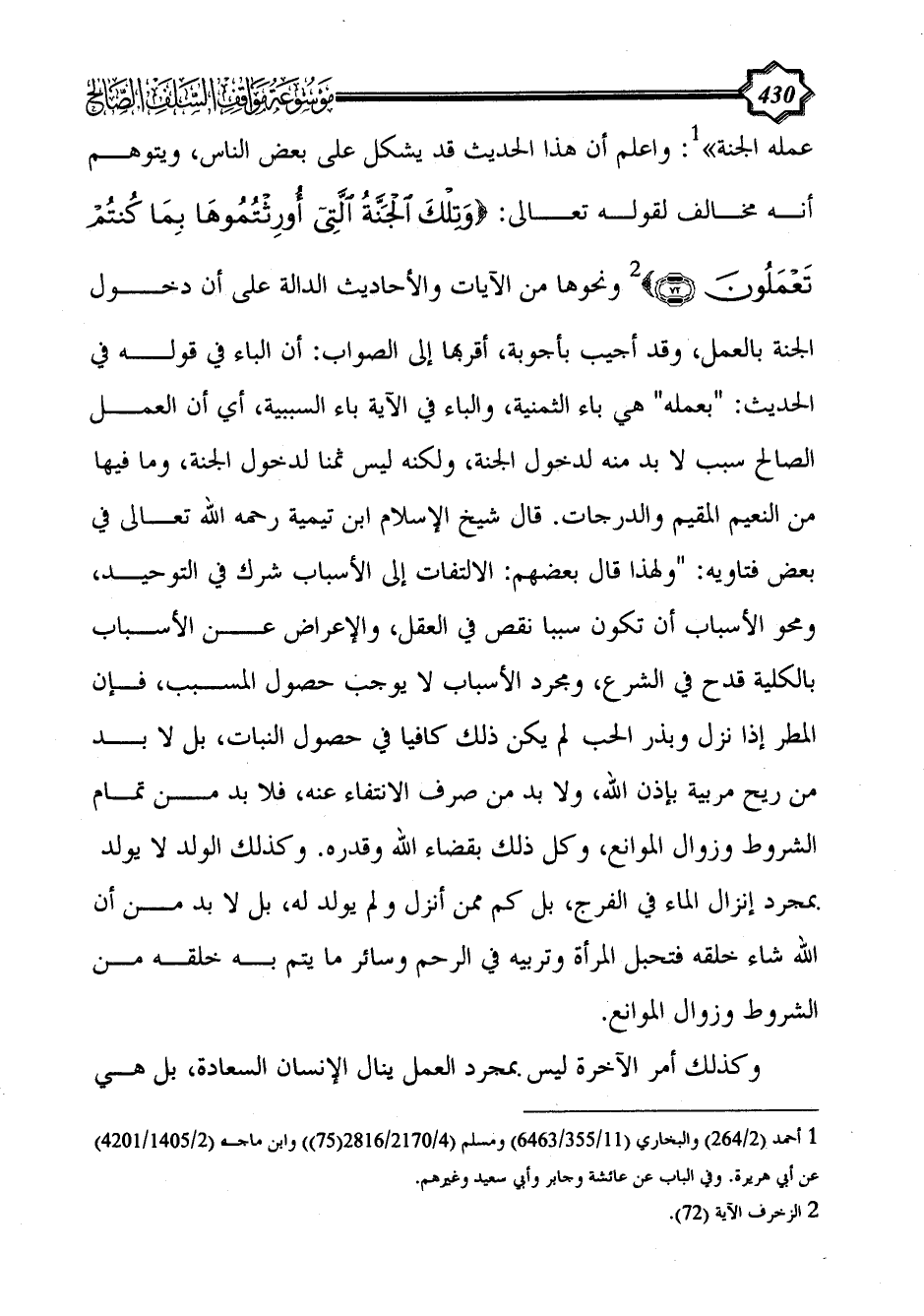 عمله الجنة» (¬1): واعلم أن هذا الحديث قد يشكل على بعض الناس، ويتوهم أنه مخالف لقوله تعالى: {وَتِلْكَ الْجَنَّةُ الَّتِي أُورِثْتُمُوهَا بِمَا كُنْتُمْ تَعْمَلُونَ (72)} (¬2) ونحوها من الآيات والأحاديث الدالة على أن دخول الجنة بالعمل، وقد أجيب بأجوبة، أقربها إلى الصواب: أن الباء في قوله في الحديث: "بعمله" هي باء الثمنية، والباء في الآية باء السببية، أي أن العمل الصالح سبب لا بد منه لدخول الجنة، ولكنه ليس ثمنا لدخول الجنة، وما فيها من النعيم المقيم والدرجات. قال شيخ الإسلام ابن تيمية رحمه الله تعالى في بعض فتاويه: "ولهذا قال بعضهم: الالتفات إلى الأسباب شرك في التوحيد، ومحو الأسباب أن تكون سببا نقص في العقل، والإعراض عن الأسباب بالكلية قدح في الشرع، ومجرد الأسباب لا يوجب حصول المسبب، فإن المطر إذا نزل وبذر الحب لم يكن ذلك كافيا في حصول النبات، بل لا بد من ريح مربية بإذن الله، ولا بد من صرف الانتفاء عنه، فلا بد من تمام الشروط وزوال الموانع، وكل ذلك بقضاء الله وقدره. وكذلك الولد لا يولد بمجرد إنزال الماء في الفرج، بل كم ممن أنزل ولم يولد له، بل لا بد من أن الله شاء خلقه فتحبل المرأة وتربيه في الرحم وسائر ما يتم به خلقه من الشروط وزوال الموانع.
