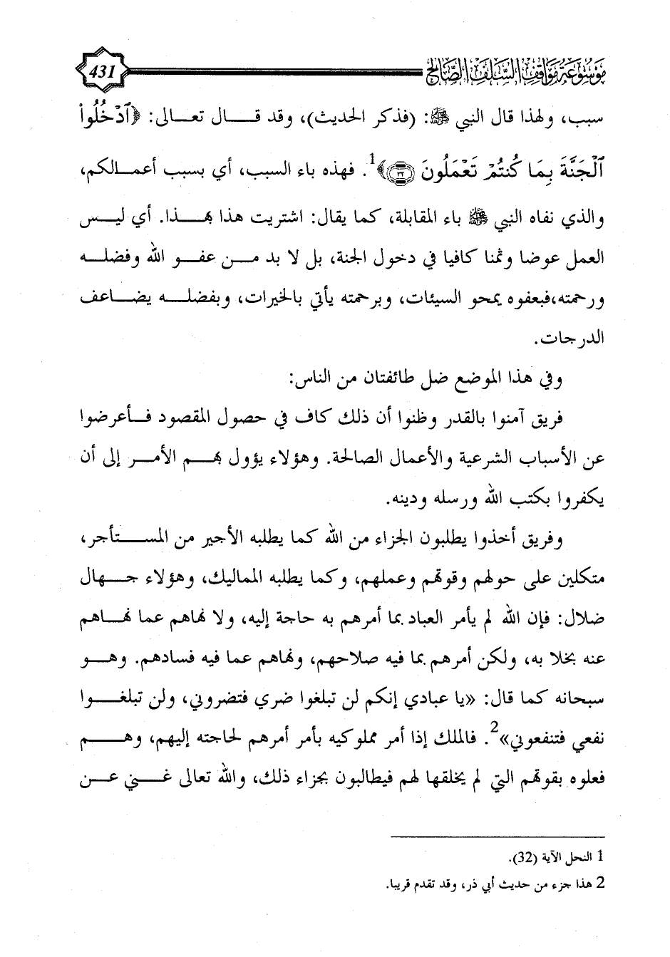 سبب، ولهذا قال النبي - صلى الله عليه وسلم -: (فذكر الحديث)، وقد قال تعالى: {ادْخُلُوا الْجَنَّةَ بِمَا كُنْتُمْ تَعْمَلُونَ (32)} (¬1). فهذه باء السبب، أي بسبب أعمالكم، والذي نفاه النبي - صلى الله عليه وسلم - باء المقابلة، كما يقال: اشتريت هذا بهذا. أي ليس العمل عوضا وثمنا كافيا في دخول الجنة، بل لا بد من عفو الله وفضله ورحمته، فبعفوه يمحو السيئات، وبرحمته يأتي بالخيرات، وبفضله يضاعف الدرجات.