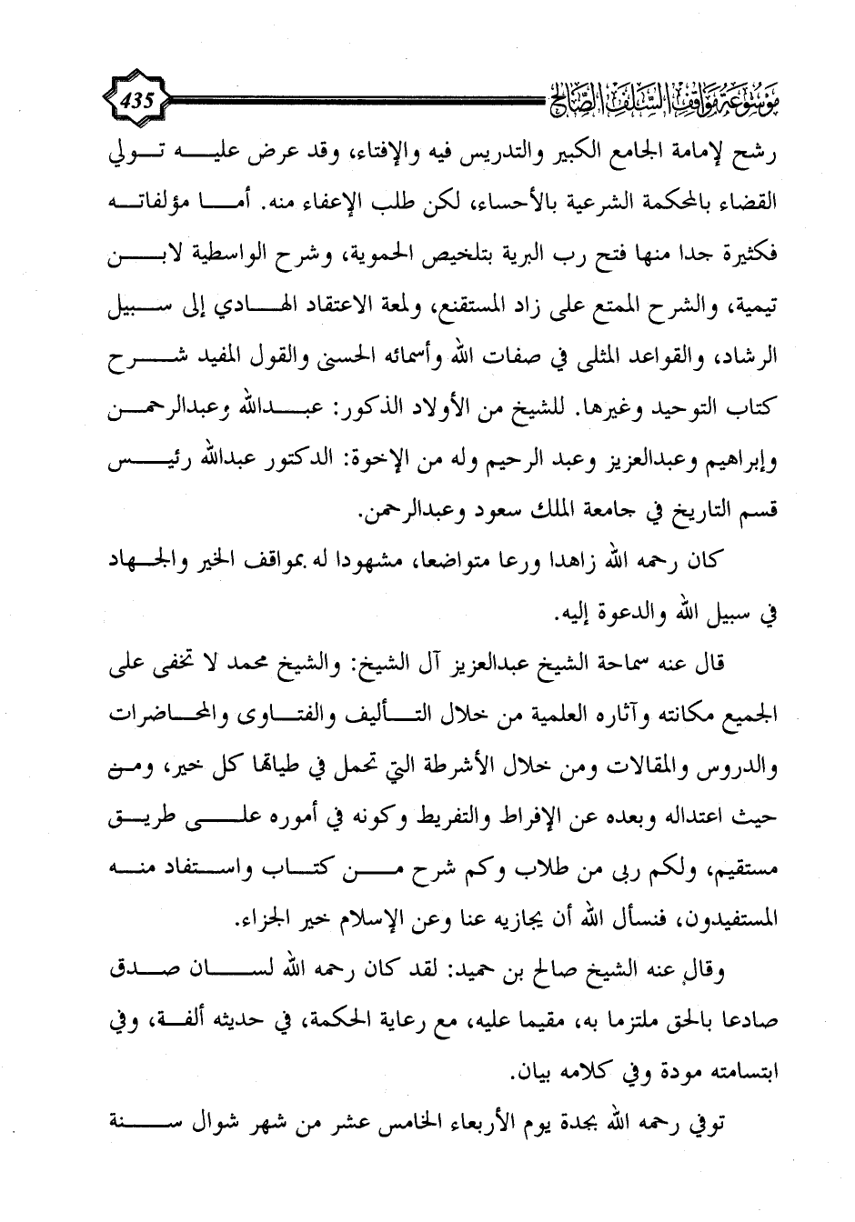 رشح لإمامة الجامع الكبير والتدريس فيه والإفتاء، وقد عرض عليه تولي القضاء بالمحكمة الشرعية بالأحساء، لكن طلب الإعفاء منه. أما مؤلفاته فكثيرة جدا منها فتح رب البرية بتلخيص الحموية، وشرح الواسطية لابن تيمية، والشرح الممتع على زاد المستقنع، ولمعة الاعتقاد الهادي إلى سبيل الرشاد، والقواعد المثلى في صفات الله وأسمائه الحسنى والقول المفيد شرح كتاب التوحيد وغيرها. للشيخ من الأولاد الذكور: عبد الله وعبد الرحمن وإبراهيم وعبد العزيز وعبد الرحيم وله من الإخوة: الدكتور عبد الله رئيس قسم التاريخ في جامعة الملك سعود وعبد الرحمن.