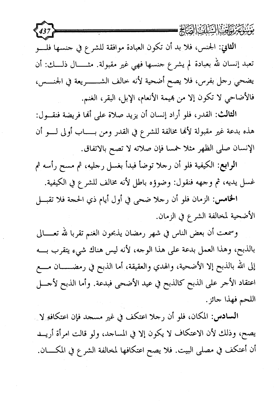 الخامس: الزمان فلو أن رجلا ضحى في أول أيام ذي الحجة فلا تقبل الأضحية لمخالفة الشرع في الزمان.