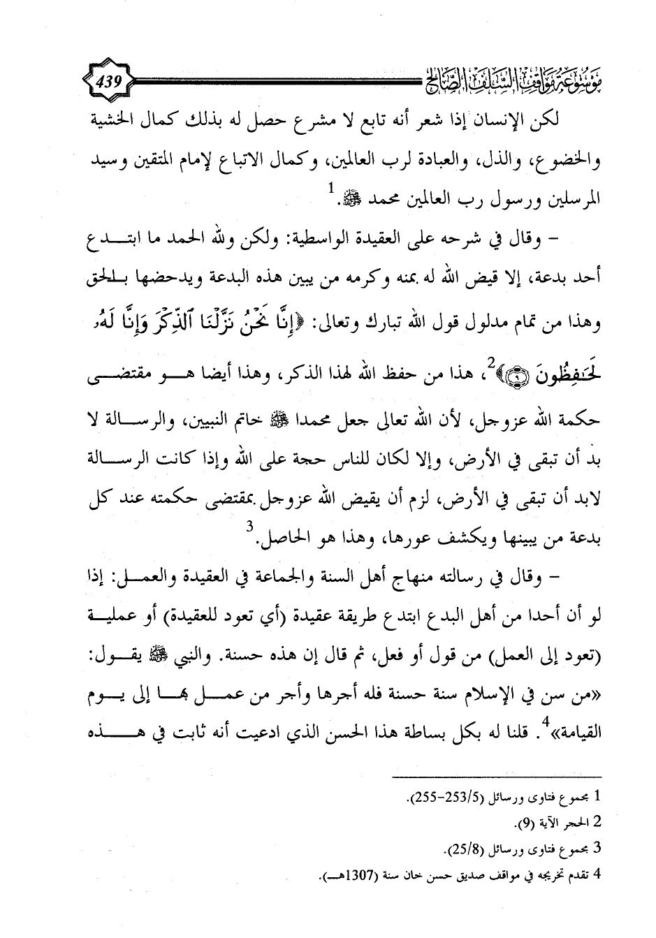 - وقال في رسالته منهاج أهل السنة والجماعة في العقيدة والعمل: إذا لو أن أحدا من أهل البدع ابتدع طريقة عقيدة (أي تعود للعقيدة) أو عملية (تعود إلى العمل) من قول أو فعل، ثم قال إن هذه حسنة. والنبي - صلى الله عليه وسلم - يقول: «من سن في الإسلام سنة حسنة فله أجرها وأجر من عمل بها إلى يوم القيامة» (¬4). قلنا له بكل بساطة هذا الحسن الذي ادعيت أنه ثابت في هذه