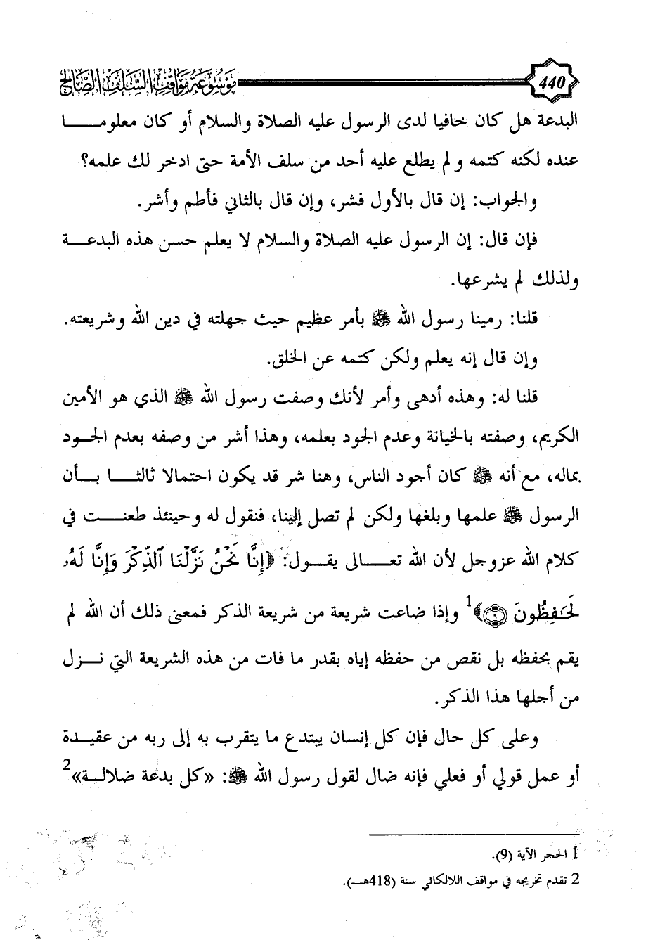 قلنا له: وهذه أدهى وأمر لأنك وصفت رسول الله - صلى الله عليه وسلم - الذي هو الأمين الكريم، وصفته بالخيانة وعدم الجود بعلمه، وهذا أشر من وصفه بعدم الجود بماله، مع أنه - صلى الله عليه وسلم - كان أجود الناس، وهنا شر قد يكون احتمالا ثالثا بأن الرسول - صلى الله عليه وسلم - علمها وبلغها ولكن لم تصل إلينا، فنقول له وحينئذ طعنت في كلام الله عزوجل لأن الله تعالى يقول: {إِنَّا نَحْنُ نَزَّلْنَا الذِّكْرَ وَإِنَّا لَهُ لَحَافِظُونَ (9)} (¬1) وإذا ضاعت شريعة من شريعة الذكر فمعنى ذلك أن الله لم يقم بحفظه بل نقص من حفظه إياه بقدر ما فات من هذه الشريعة التي نزل من أجلها هذا الذكر.