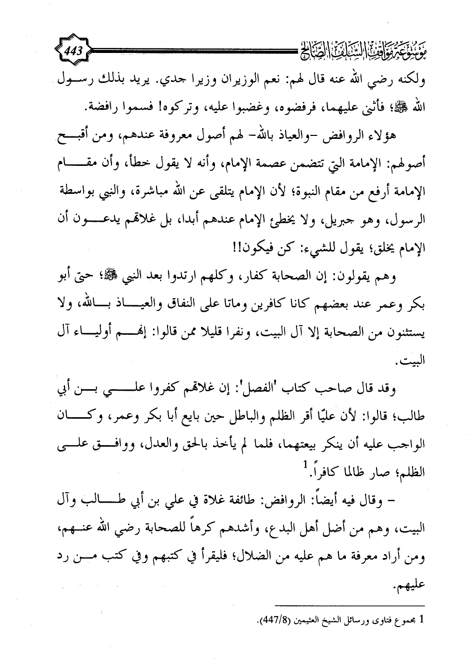 - وقال فيه أيضاً: الروافض: طائفة غلاة في علي بن أبي طالب وآل البيت، وهم من أضل أهل البدع، وأشدهم كرهاً للصحابة رضي الله عنهم، ومن أراد معرفة ما هم عليه من الضلال؛ فليقرأ في كتبهم وفي كتب من رد عليهم.