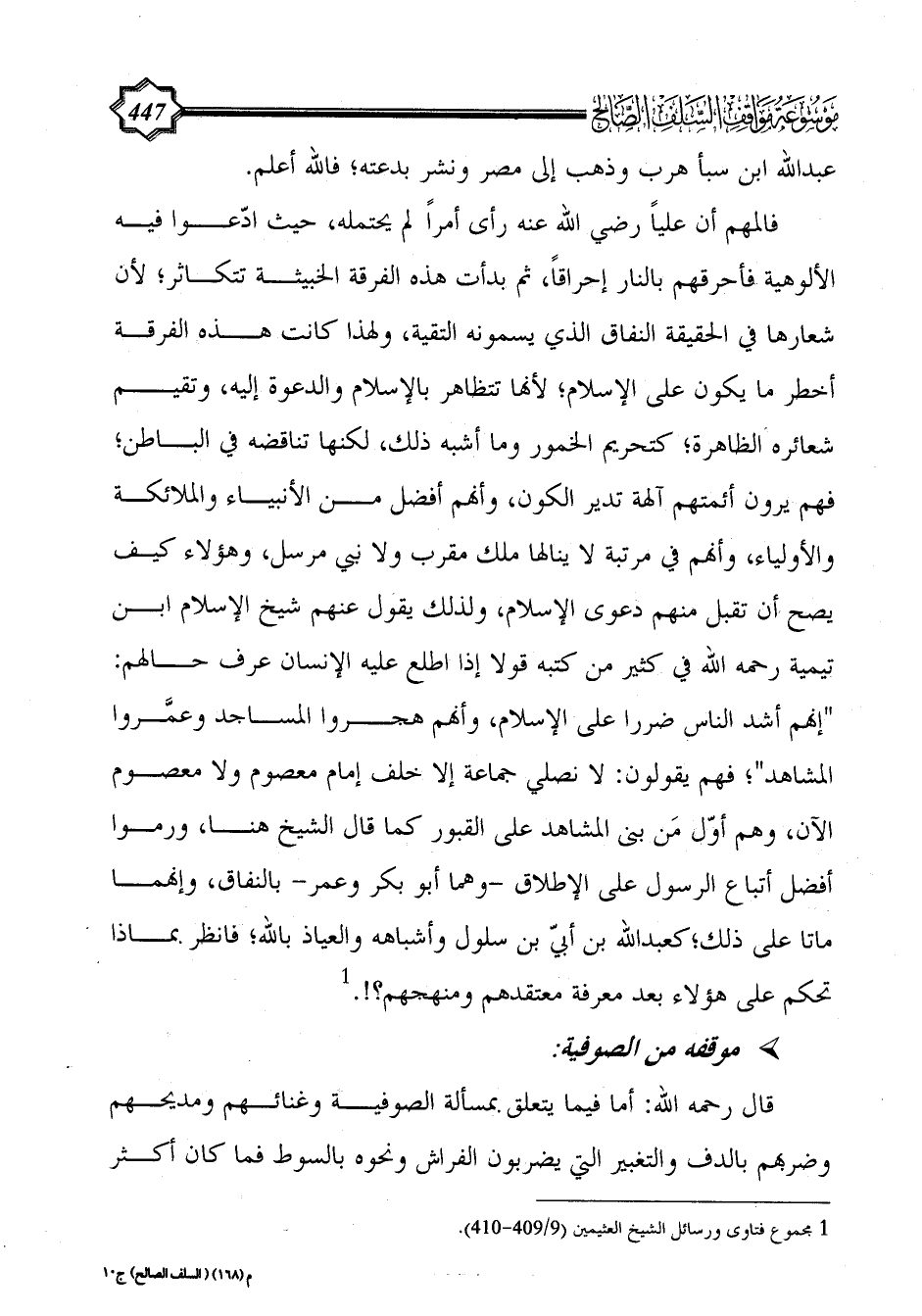 فالمهم أن علياً رضي الله عنه رأى أمراً لم يحتمله، حيث ادّعوا فيه الألوهية فأحرقهم بالنار إحراقاً، ثم بدأت هذه الفرقة الخبيثة تتكاثر؛ لأن شعارها في الحقيقة النفاق الذي يسمونه التقية، ولهذا كانت هذه الفرقة أخطر ما يكون على الإسلام؛ لأنها تتظاهر بالإسلام والدعوة إليه، وتقيم شعائره الظاهرة؛ كتحريم الخمور وما أشبه ذلك، لكنها تناقضه في الباطن؛ فهم يرون أئمتهم آلهة تدير الكون، وأنهم أفضل من الأنبياء والملائكة والأولياء، وأنهم في مرتبة لا ينالها ملك مقرب ولا نبي مرسل، وهؤلاء كيف يصح أن تقبل منهم دعوى الإسلام، ولذلك يقول عنهم شيخ الإسلام ابن تيمية رحمه الله في كثير من كتبه قولا إذا اطلع عليه الإنسان عرف حالهم: "إنهم أشد الناس ضررا على الإسلام، وأنهم هجروا المساجد وعمَّروا المشاهد"؛ فهم يقولون: لا نصلي جماعة إلا خلف إمام معصوم ولا معصوم الآن، وهم أوّل مَن بنى المشاهد على القبور كما قال الشيخ هنا، ورموا أفضل أتباع الرسول على الإطلاق -وهما أبو بكر وعمر- بالنفاق، وإنهما ماتا على ذلك؛ كعبد الله بن أبيّ بن سلول وأشباهه والعياذ بالله؛ فانظر بماذا تحكم على هؤلاء بعد معرفة معتقدهم ومنهجهم؟!. (¬1)