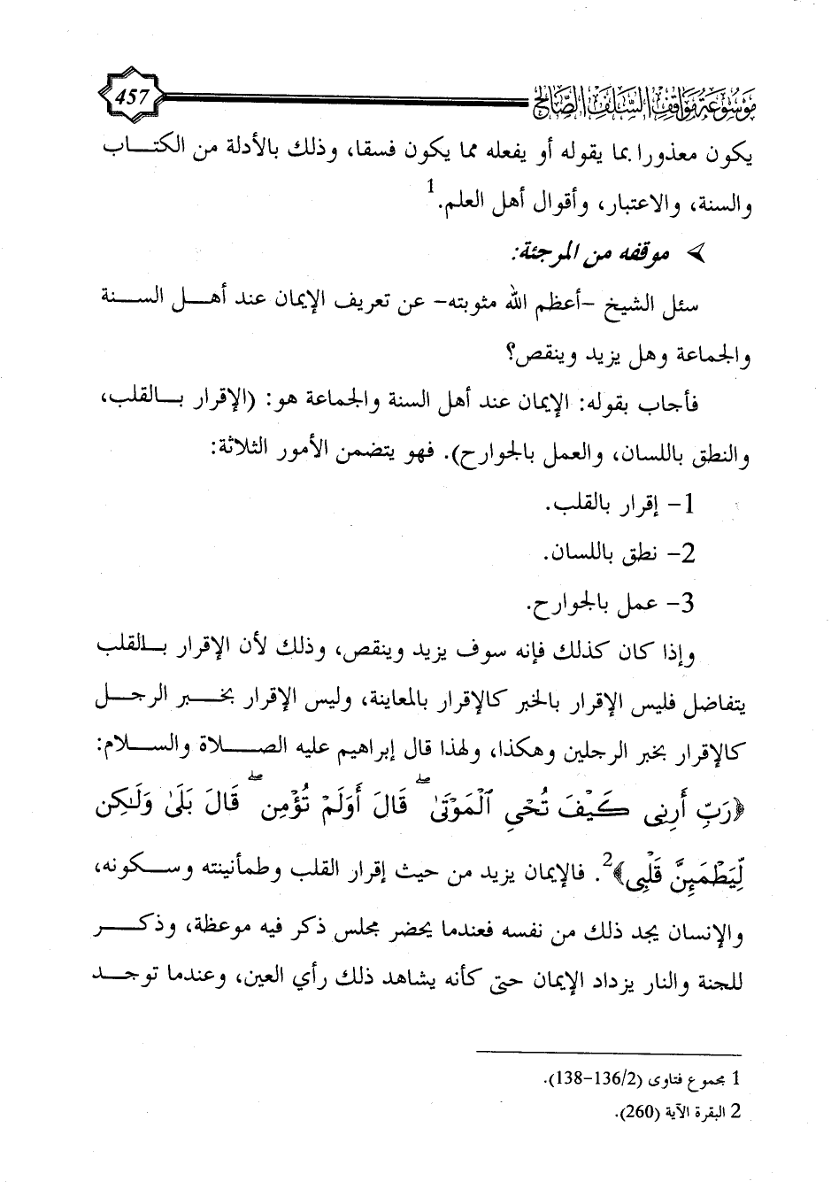وإذا كان كذلك فإنه سوف يزيد وينقص، وذلك لأن الإقرار بالقلب يتفاضل فليس الإقرار بالخبر كالإقرار بالمعاينة، وليس الإقرار بخبر الرجل كالإقرار بخبر الرجلين وهكذا، ولهذا قال إبراهيم عليه الصلاة والسلام: {رَبِّ أَرِنِي كَيْفَ تُحْيِي الْمَوْتَى قَالَ أَوَلَمْ تُؤْمِنْ قَالَ بَلَى وَلَكِنْ لِيَطْمَئِنَّ قَلْبِي} (¬2). فالإيمان يزيد من حيث إقرار القلب وطمأنينته وسكونه، والإنسان يجد ذلك من نفسه فعندما يحضر مجلس ذكر فيه موعظة، وذكر للجنة والنار يزداد الإيمان حتى كأنه يشاهد ذلك رأي العين، وعندما توجد