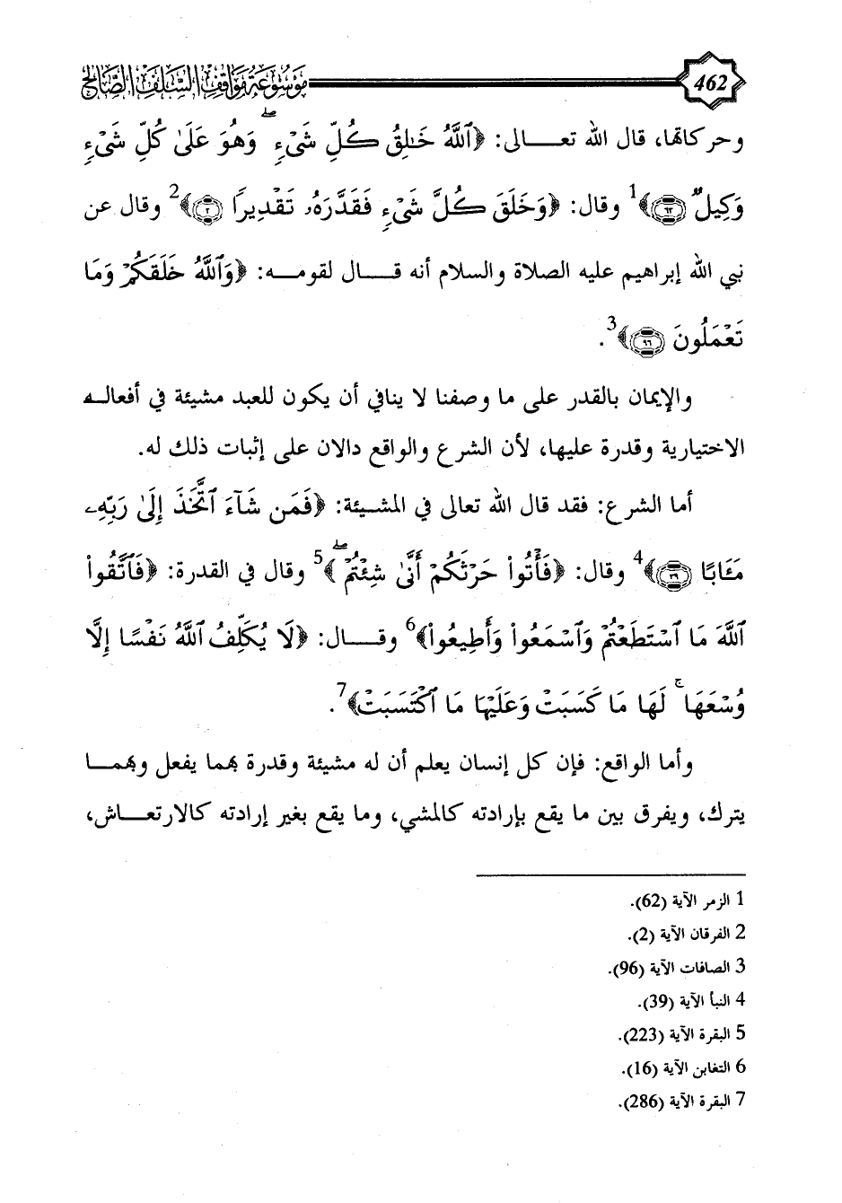 وحركاتها، قال الله تعالى: {اللَّهُ خَالِقُ كُلِّ شَيْءٍ وَهُوَ عَلَى كُلِّ شَيْءٍ وَكِيلٌ (62)} (¬1) وقال: {وَخَلَقَ كُلَّ شَيْءٍ فَقَدَّرَهُ تَقْدِيرًا (2)} (¬2) وقال عن نبي الله إبراهيم عليه الصلاة والسلام أنه قال لقومه: {وَاللَّهُ خَلَقَكُمْ وَمَا تَعْمَلُونَ (96)} (¬3).