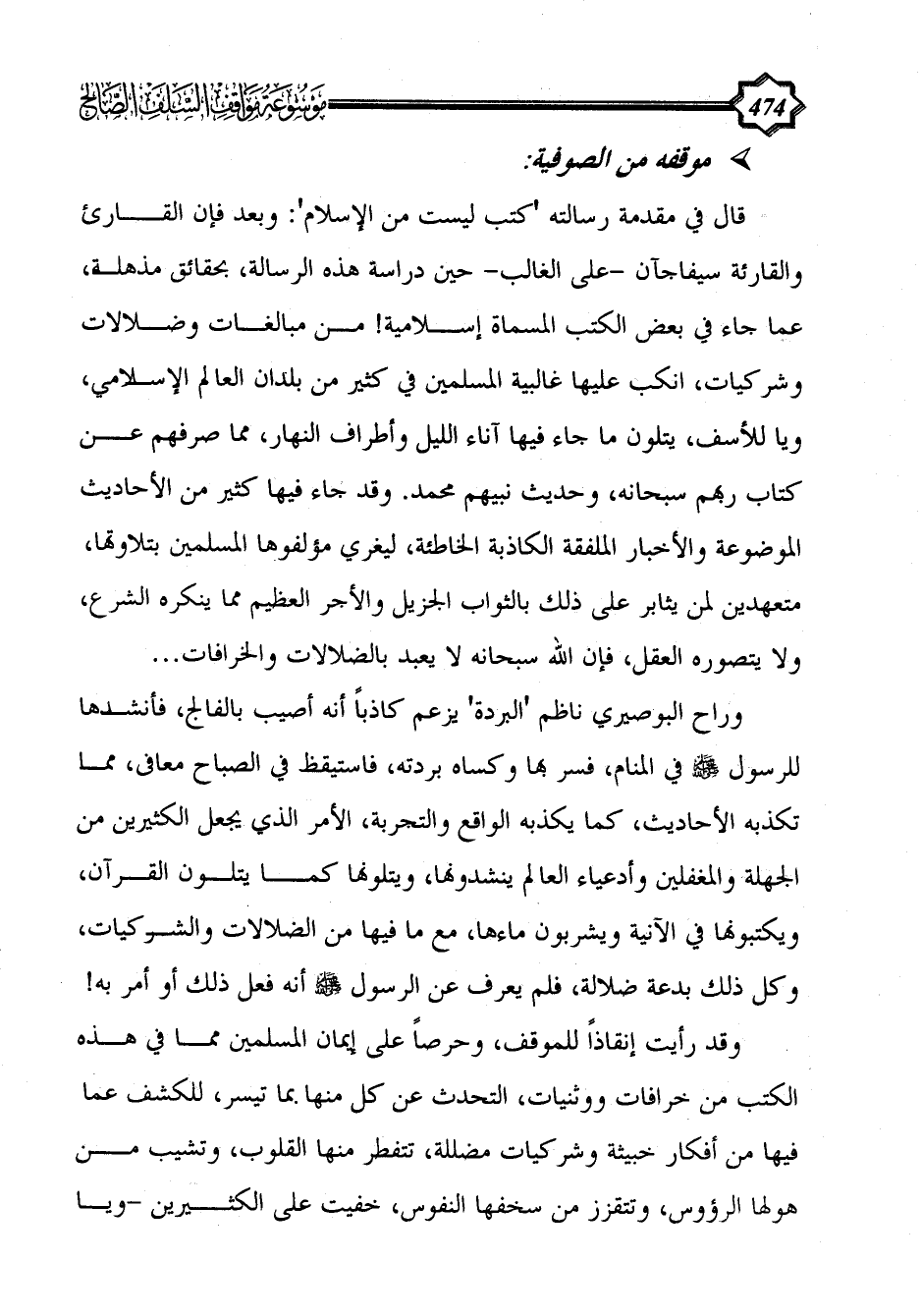 قال في مقدمة رسالته 'كتب ليست من الإسلام': وبعد فإن القارئ والقارئة سيفاجآن -على الغالب- حين دراسة هذه الرسالة، بحقائق مذهلة، عما جاء في بعض الكتب المسماة إسلامية! من مبالغات وضلالات وشركيات، انكب عليها غالبية المسلمين في كثير من بلدان العالم الإسلامي، ويا للأسف، يتلون ما جاء فيها آناء الليل وأطراف النهار، مما صرفهم عن كتاب ربهم سبحانه، وحديث نبيهم محمد. وقد جاء فيها كثير من الأحاديث الموضوعة والأخبار الملفقة الكاذبة الخاطئة، ليغري مؤلفوها المسلمين بتلاوتها، متعهدين لمن يثابر على ذلك بالثواب الجزيل والأجر العظيم مما ينكره الشرع، ولا يتصوره العقل، فإن الله سبحانه لا يعبد بالضلالات والخرافات ...