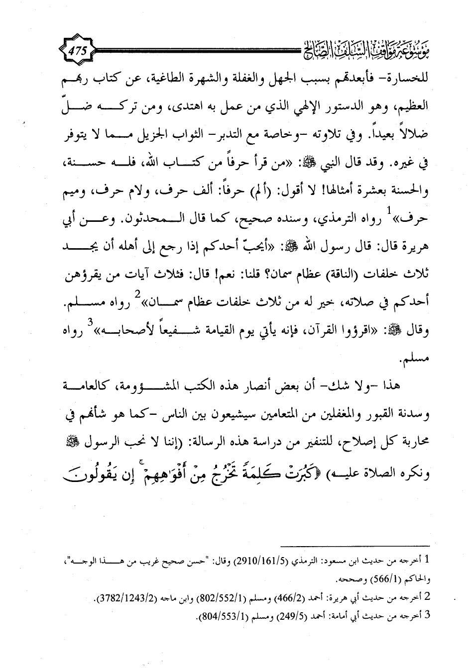 للخسارة- فأبعدتهم بسبب الجهل والغفلة والشهرة الطاغية، عن كتاب ربهم العظيم، وهو الدستور الإلهي الذي من عمل به اهتدى، ومن تركه ضلّ ضلالاً بعيداً. وفي تلاوته -وخاصة مع التدبر- الثواب الجزيل مما لا يتوفر في غيره. وقد قال النبي - صلى الله عليه وسلم -: «من قرأ حرفاً من كتاب الله، فله حسنة، والحسنة بعشرة أمثالها! لا أقول: (ألم) حرفاً: ألف حرف، ولام حرف، وميم حرف» (¬1) رواه الترمذي، وسنده صحيح، كما قال المحدثون. وعن أبي هريرة قال: قال رسول الله - صلى الله عليه وسلم -: «أيحبّ أحدكم إذا رجع إلى أهله أن يجد ثلاث خلفات (الناقة) عظام سمان؟ قلنا: نعم! قال: فثلاث آيات من يقرؤهن أحدكم في صلاته، خير له من ثلاث خلفات عظام سمان» (¬2) رواه مسلم. وقال - صلى الله عليه وسلم -: «اقرؤوا القرآن، فإنه يأتي يوم القيامة شفيعاً لأصحابه» (¬3) رواه مسلم.